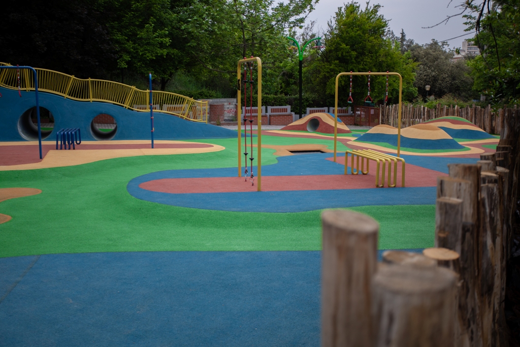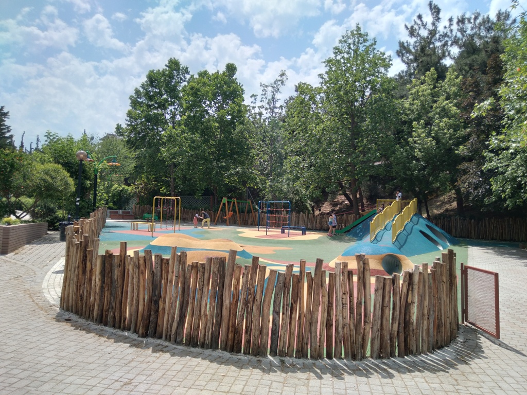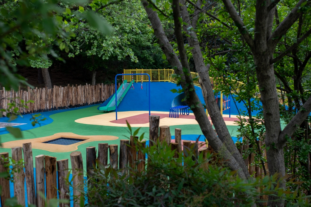 Μάλιστα, η περίφραξη είναι φυσική, από ξύλινους κορμούς και η γενικότερη αισθητική του νέου παιδότοπου δένει αρμονικά με τον περιβάλλοντα χώρο που δεν θυμίζει αστικό τοπίο.