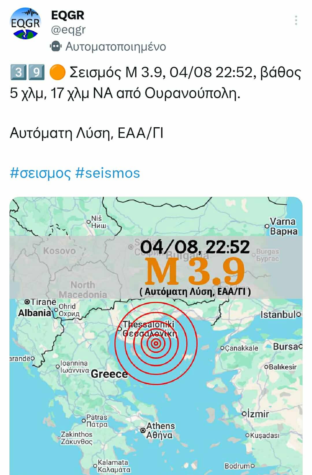 Σεισμός 3,9 ρίχτερ σημειώθηκε στην Ουρανούπολη Χαλκιδικής.