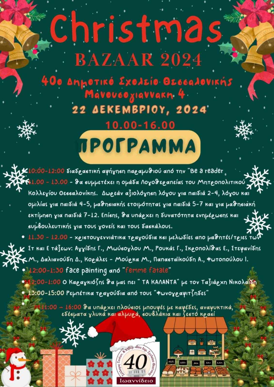 Χριστουγεννιάτικο bazaar διοργανώνει αύριο Κυριακή το 40 δημοτικό σχολείο Θεσσαλονίκης, στο κέντρο της πόλης.