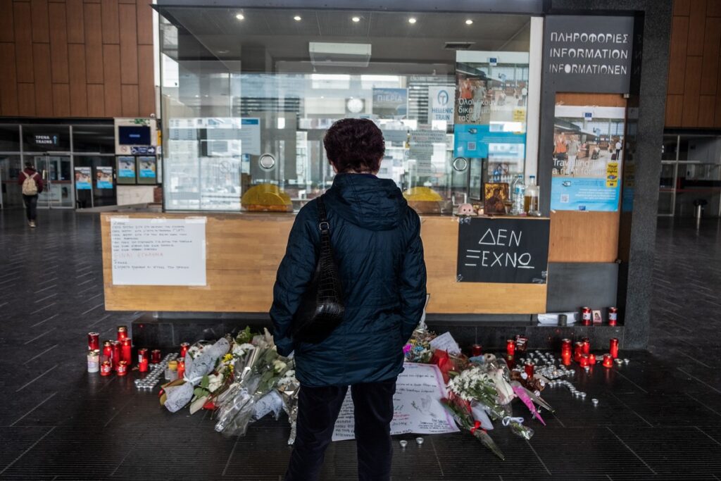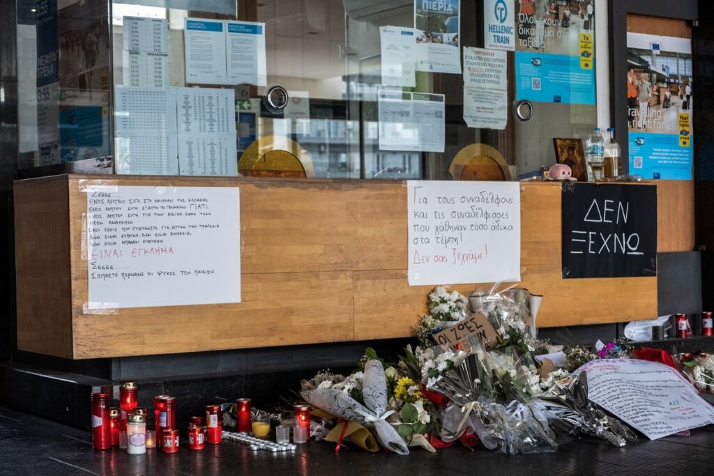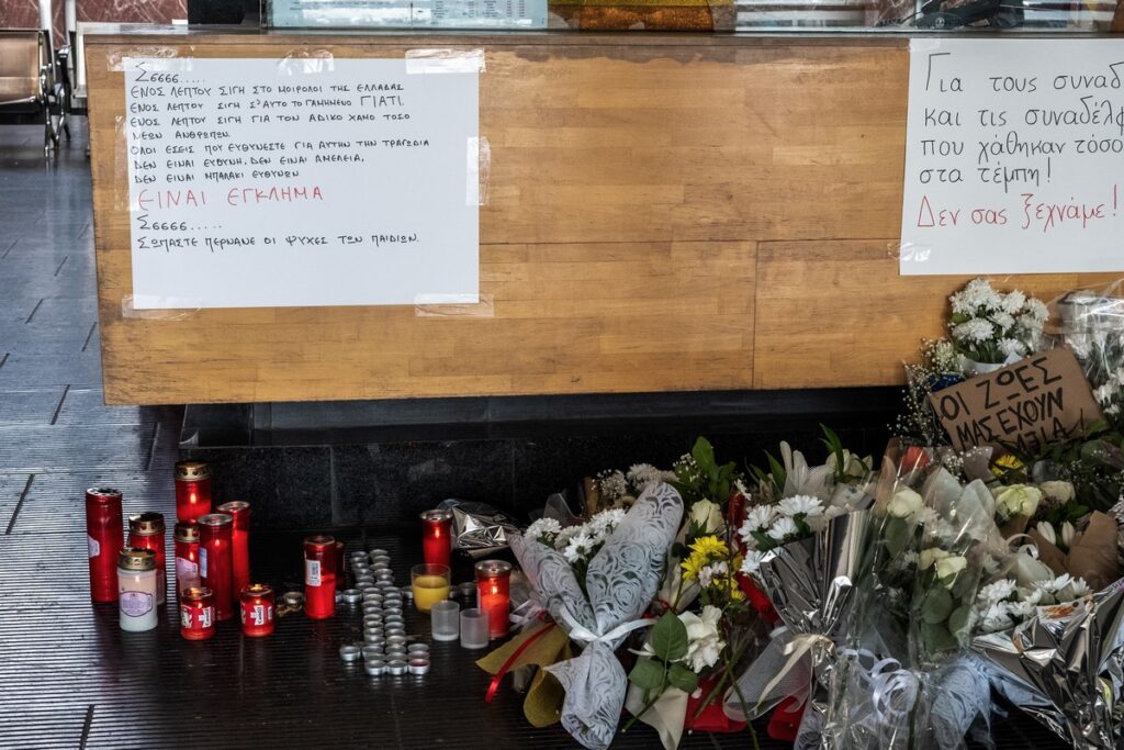 (ΡΑΦΑΗΛ ΓΕΩΡΓΙΑΔΗΣ/EUROKINISSI)Στιγμιότυπο από τον Νέο Σιδηροδρομικό Σταθμό Θεσσαλονίκης όπου κόσμος αφήνει λουλούδια, κεριά και σημειώματα για τα θύματα του πολύνεκρου σιδηροδρομικού δυστυχήματος στα Τέμπη, Παρασκευή 3 Μαρτίου 2023.