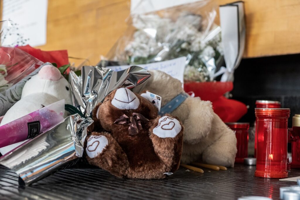 Σημειώματα, λουλούδια, κεριά, μια εικόνα της Παναγίας και αρκουδάκια αφήνουν οι πολίτες στον Σιδηροδρομικό Σταθμό Θεσσαλονίκης.