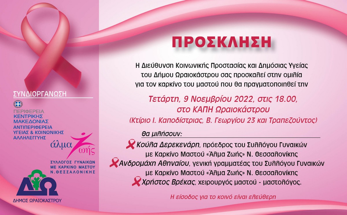 Η Αντιπεριφέρεια Υγείας και Κοινωνικής Αλληλεγγύης της Περιφέρειας Κεντρικής Μακεδονίας, η Διεύθυνση Κοινωνικής Προστασίας και Δημόσιας Υγείας του Δήμου Ωραιοκάστρου και ο Σύλλογος Γυναικών με Καρκίνο Μαστού Ν. Θεσσαλονίκης «Άλμα Ζωής» συνδιοργανώνουν δράσεις, με στόχο την ευαισθητοποίηση και την ενημέρωση των γυναικών σχετικά με τον καρκίνο του μαστού.