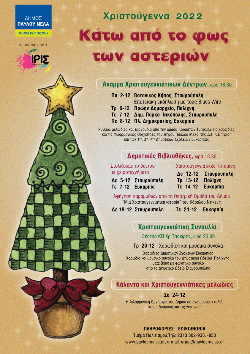 Οι χριστουγεννιάτικες εκδηλώσεις διοργανώνονται με την υποστήριξη της Δημοτικής Κοινωφελούς Επιχείρησης ΙΡΙΣ του Δήμου Παύλου Μελά