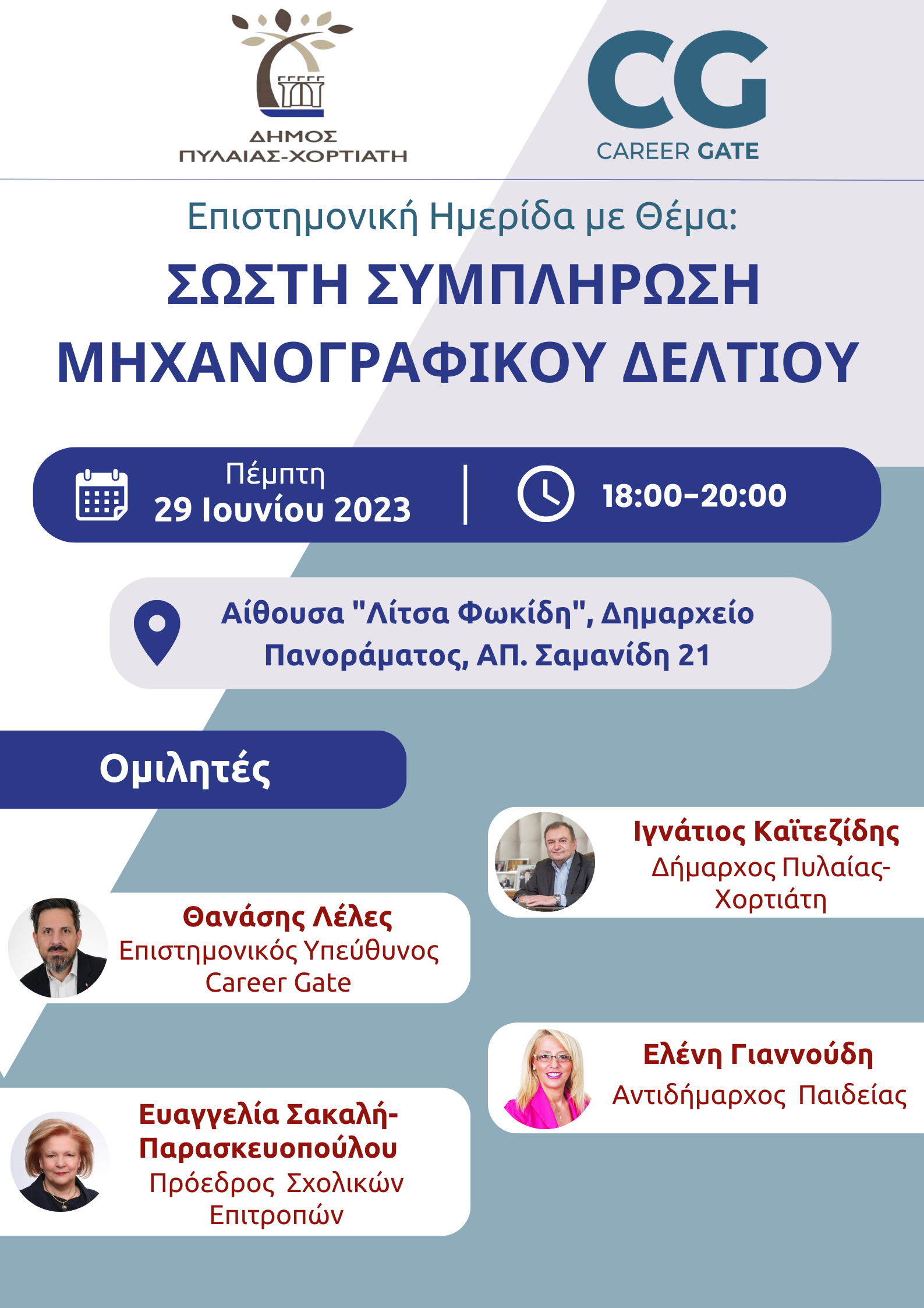 Χαιρετισμό θα απευθύνουν ο δήμαρχος Ιγνάτιος Καϊτεζίδης και η αντιδήμαρχος Παιδείας Ελένη Γιαννούδη, ενώ κεντρικοί ομιλητές της εκδήλωσης θα είναι ο επιστημονικός σύμβουλος της Career Gate, Θανάσης Λέλες και η Πρόεδρος των σχολικών επιτροπών δήμου Πυλαίας Χορτιάτη Ευαγγελία Σακαλή Παρασκευοπούλου.