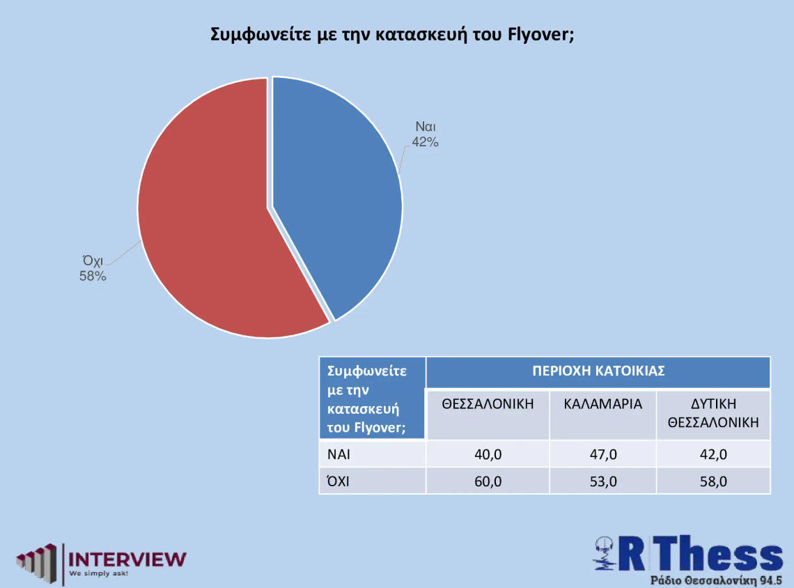 Σύμφωνα με την δημοσκόπηση το 58% των ερωτώμενων δεν συμφωνεί με την κατασκευή του Flyover, έναντι του 42% που συμφωνεί, ενώ παράλληλα το 54% εκτιμά ότι το έργο δεν θα βοηθήσει στο κυκλοφοριακό πρόβλημα της Θεσσαλονίκης.