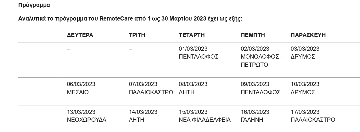 Αρχίζει τη λειτουργία του το πρόγραμμα «RemoteCare» στον Δήμο Ωραιοκάστρου προκειμένου να παρέχει στους πολίτες ιατρικές εξετάσεις στον τόπο κατοικίας τους εντελώς δωρεάν ακόμη και σε απομακρυσμένες περιοχές 1 ως 30 Μαρτίου 2023.