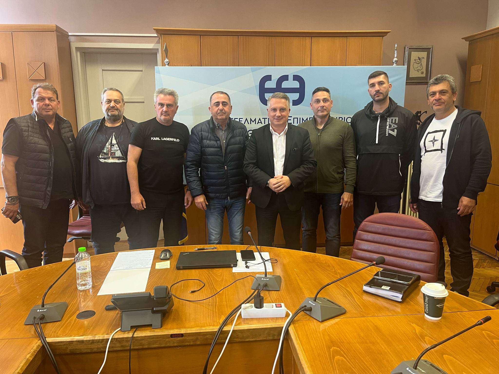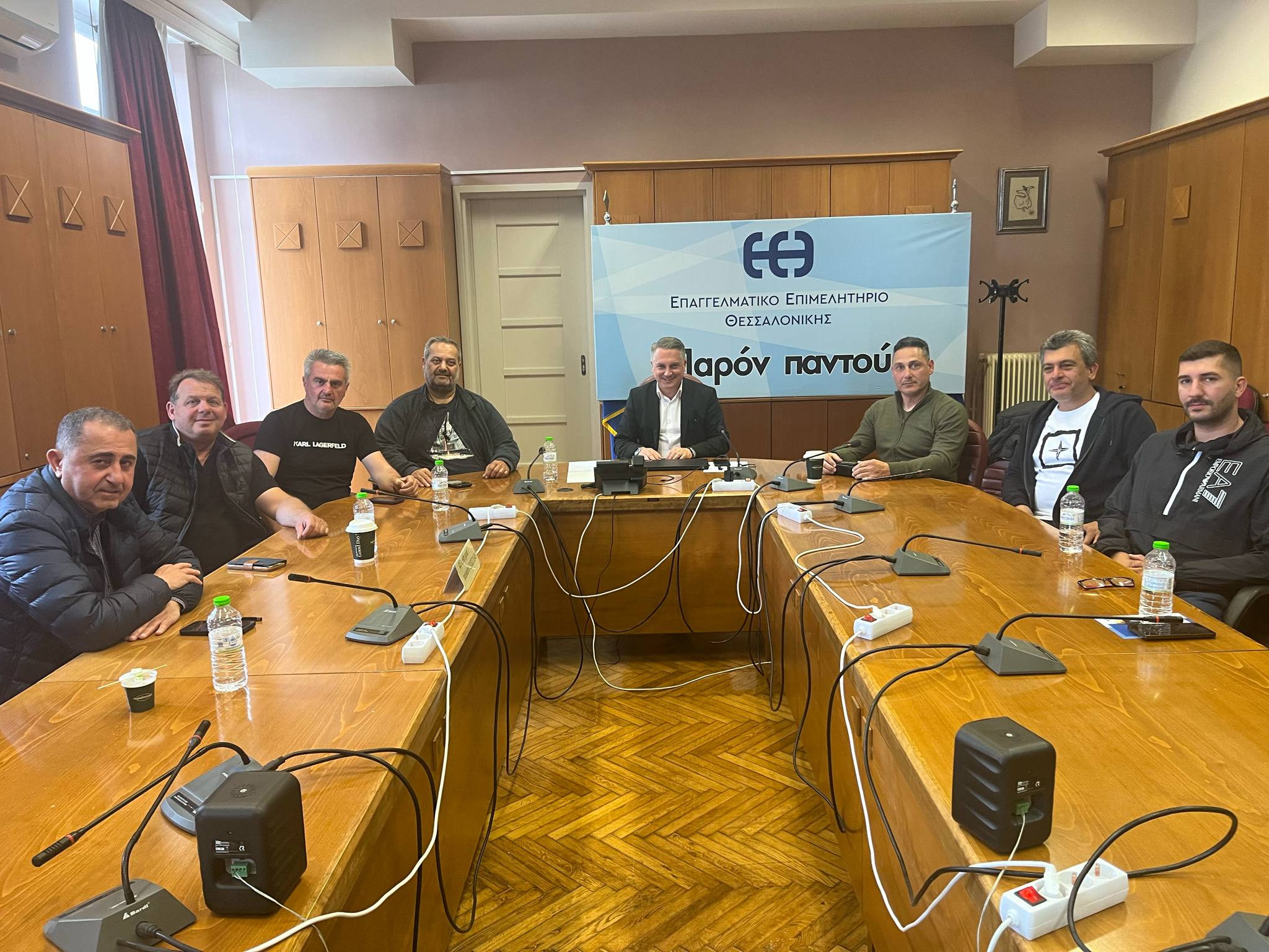 Συνάντηση πραγματοποίησε ο πρόεδρος του Επαγγελματικού Επιμελητήριου Θεσσαλονίκης (Ε.Ε.Θ.) Κυριάκος Μερελής με τον πρόεδρο Απόστολο Κενανίδη και εκπροσώπους της διοίκησης της Ομοσπονδίας Φορτηγών Αυτοκινητιστών Ελλάδος Διεθνών Μεταφορών (ΟΦΑΕ), ο οποίος τους υποδέχθηκε στην έδρα του Επιμελητηρίου.