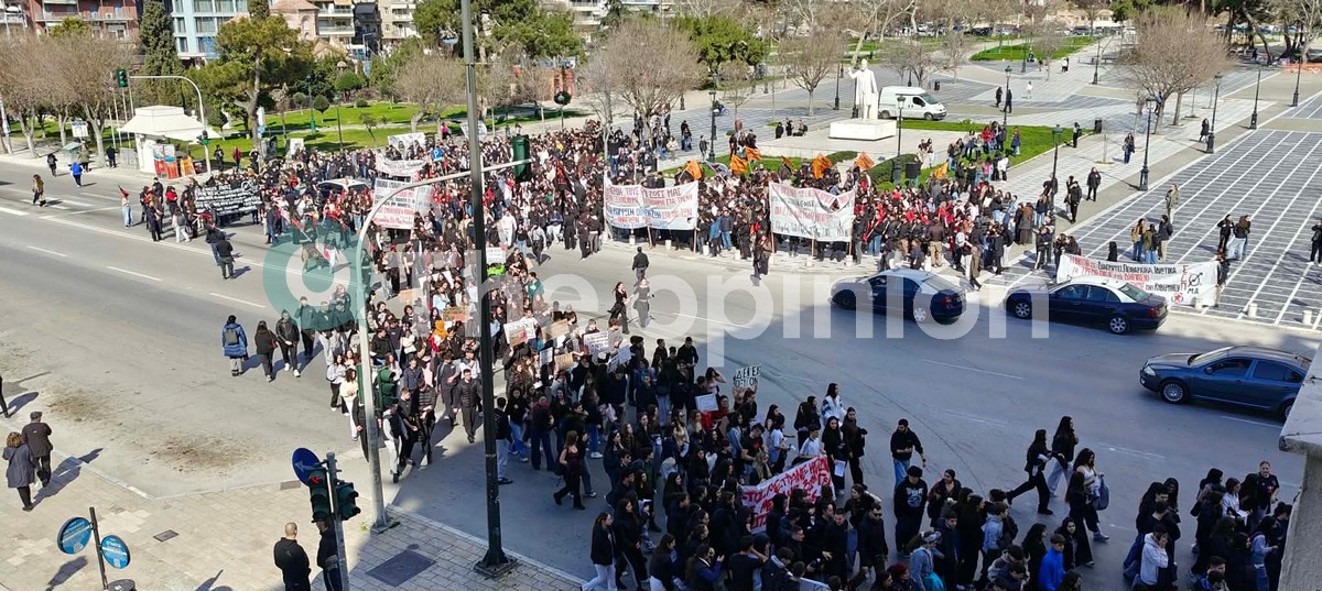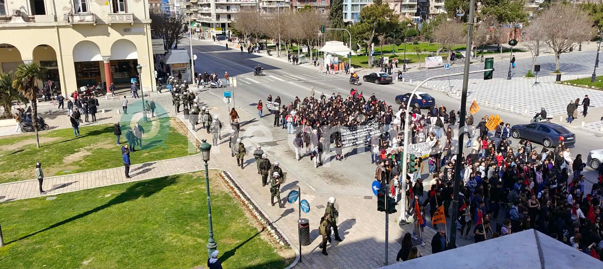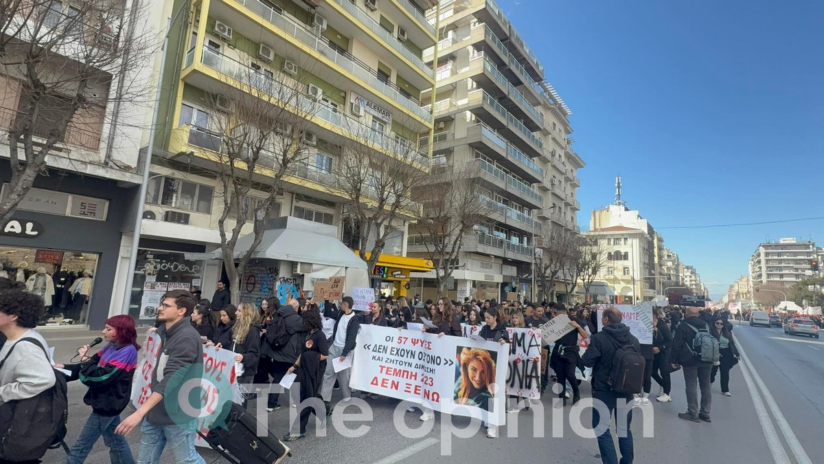 Η πορεία που ξεκίνησε λίγο μετά της 12:30 και κινείται σε κεντρικούς δρόμους της Θεσσαλονίκης. Η πορεία θα κατευθυνθεί στις οδούς Εγνατία, Αγίας Σοφίας, Τσιμισκή και Βενιζέλου ενώ τα μπλόκ αναμένεται να καταλήξουν στο Υπουργείο Μακεδονίας Θράκης. Οι μαθητές κρατούν πανό και πλακάτ με συνθήματα στη μνήμη των θυμάτων της τραγωδίας. «Ήταν η κακιά η (χ)ώρα» είναι το κεντρικό σύνθημα και φέτος, ενώ μεταξύ άλλων ακούγονται συνθήματα για καλύτερες συνθήκες εργασίες και φοίτησης στα πανεπιστήμια. Υπενθυμίζεται ότι μαθητές και φοιτητές αναμένεται να συμμετάσχουν και στις μεγάλες κινητοποιήσεις της Θεσσαλονίκης στην επέτειο του τραγικού δυστυχήματος, το Σάββατο 28 Φεβρουαρίου.