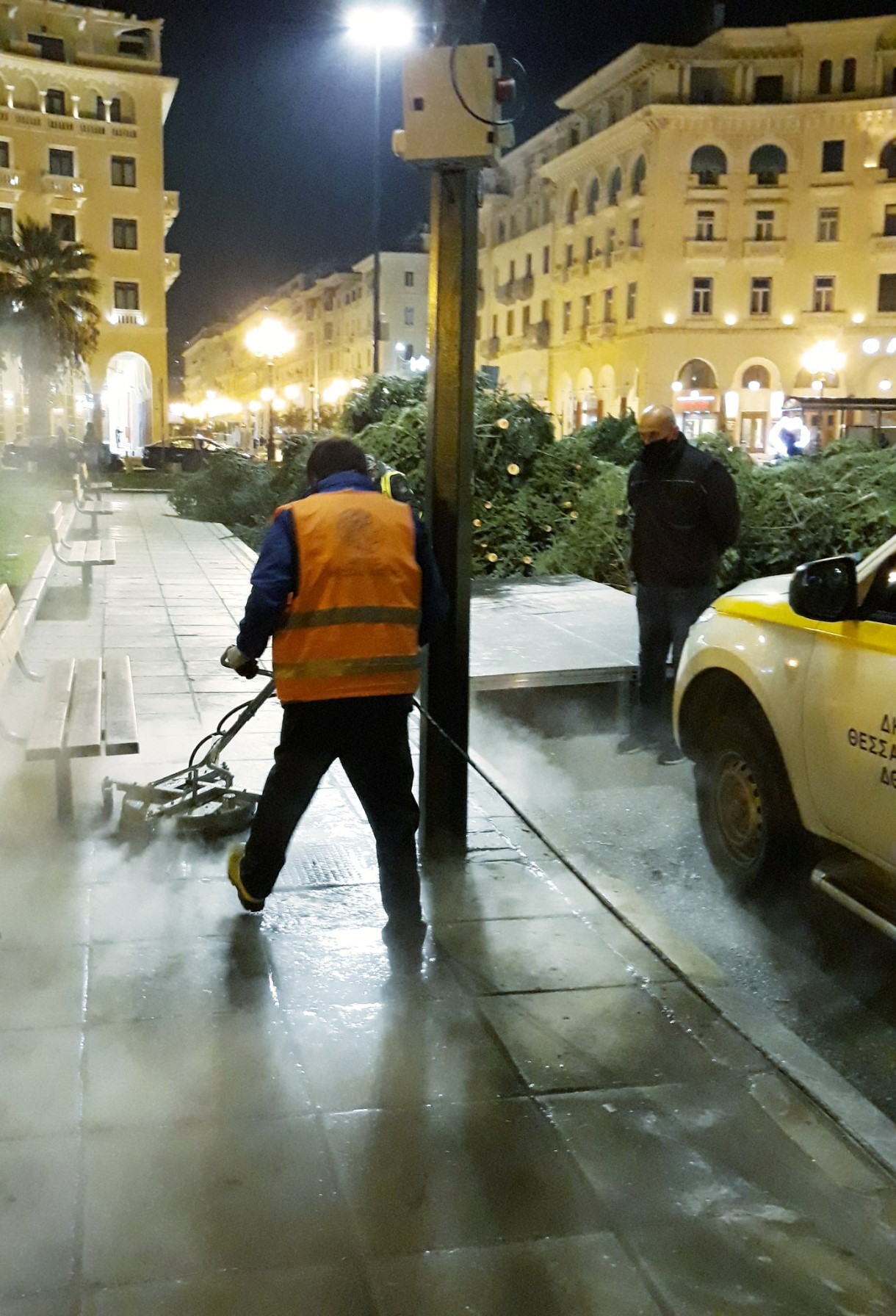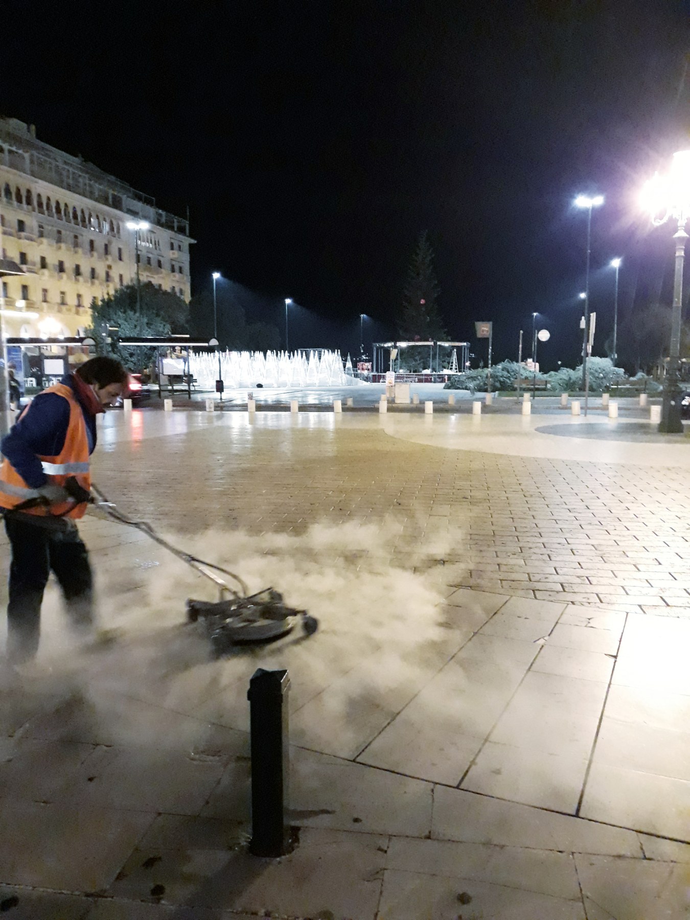 Οι πρώτες δοκιμαστικές επιχειρήσεις καθαριότητας με τη χρήση του νέου μηχανήματος οργανώνονται στην πλατεία Αριστοτέλους και στον άξονα της Δημητρίου Γούναρη, που τμηματικά καθαρίζονται σε βάθος και αποκτούν νέα εικόνα.