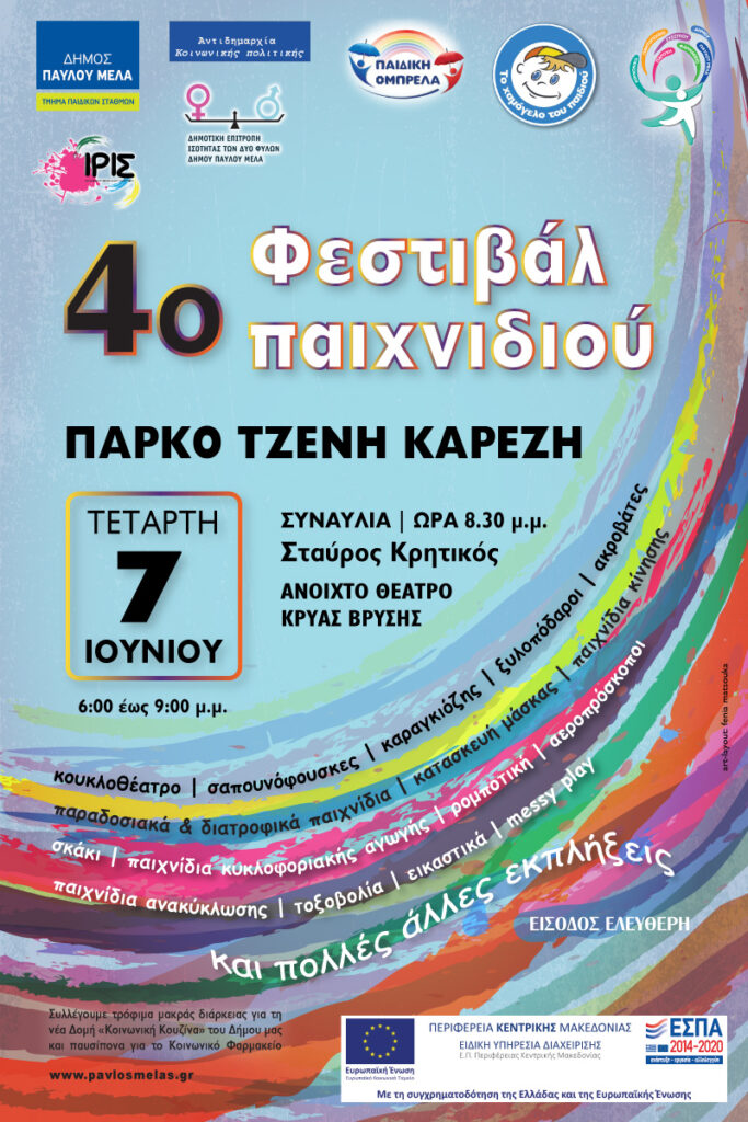 Η Αντιδημαρχία Κοινωνικής Πολιτικής του Δήμου Παύλου Μελά και συγκεκριμένα το Τμήμα Παιδικών Σταθμών, με στόχο την ψυχαγωγία και την εκπαίδευση των παιδιών της πόλης, διοργανώνουν το 4ο Φεστιβάλ Παιχνιδιού, μεταμορφώνοντας το πάρκο Τζένη Καρέζη, σε ένα τεράστιο παιχνιδότοπο με πολλές δράσεις και εκπλήξεις. Μικροί και μεγάλοι θα έχουν την ευκαιρία να διασκεδάσουν στον μαγικό κόσμο του παιχνιδιού, της τέχνης και του πολιτισμού, συμμετέχοντας σε παραδοσιακά και σε πιο σύγχρονα παιχνίδια, απολαμβάνοντας ποιοτική ψυχαγωγία για όλη την οικογένεια.
