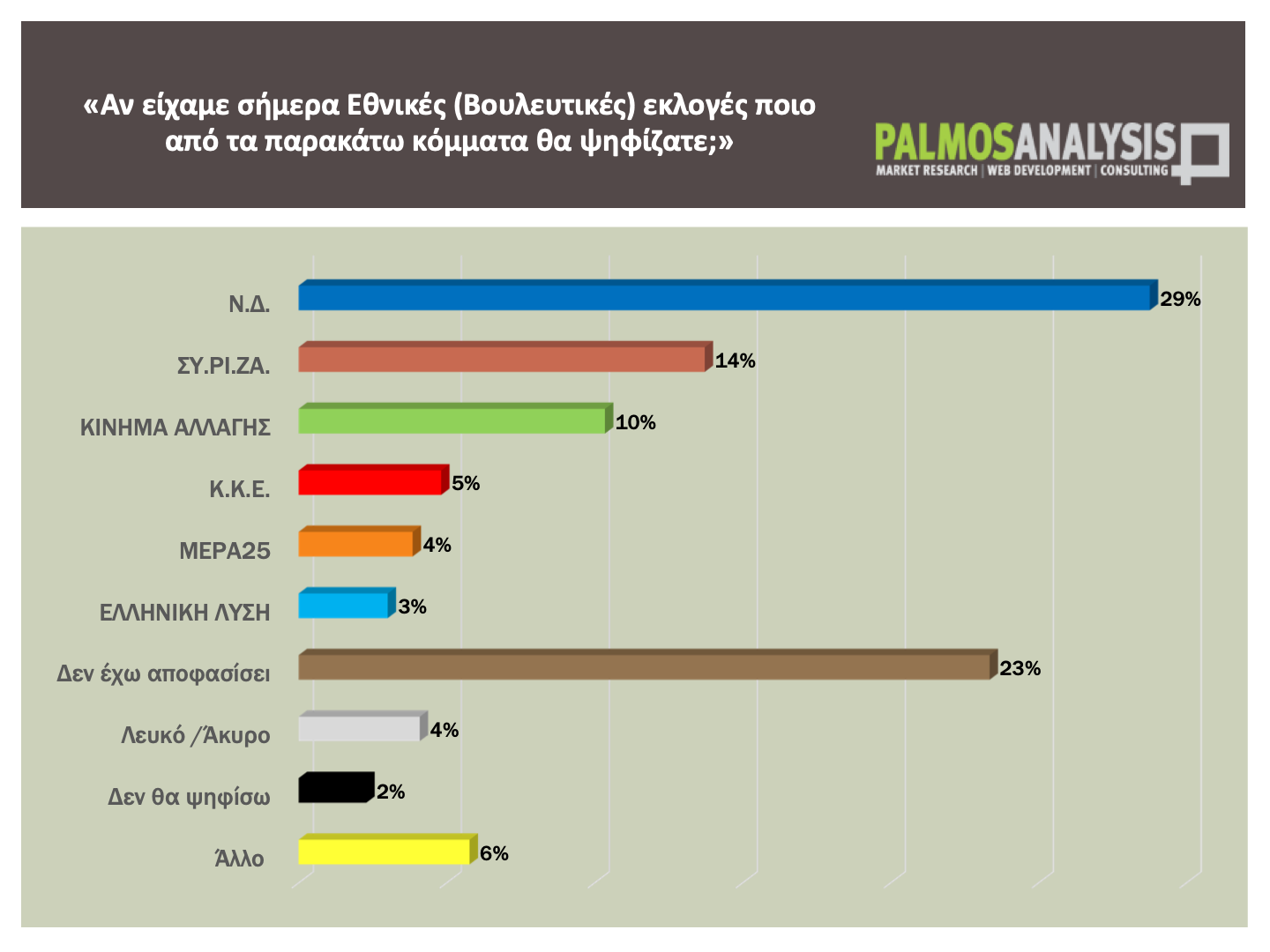 Τέλος στην ερώτηση του τι θα ψήφιζαν αν είχαμε εθνικές εκλογές σήμερα, πρώτη έρχεται η Νέα Δημοκρατία με 15 μονάδες διαφορά από τον ΣΥΡΙΖΑ που καταλαμβάνει τη δεύτερη θέση.