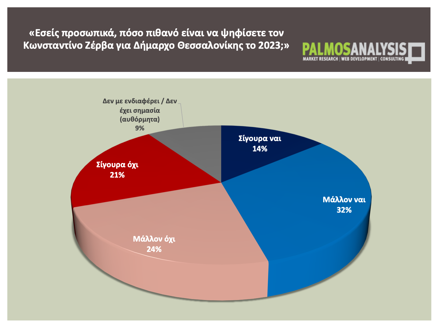 Για λογαριασμό της εφημερίδας «Μακεδονία» πραγματοποίησε έρευνα η Palmos Analysis το διάστημα 12-18 Ιανουαρίου 2022, με τους Θεσσαλονικείς να σχολιάζουν το πως βλέπουν την πόλη, ποια είναι τα κύρια προβλήματά της, τον ρόλο του δήμου Θεσσαλονίκης, αλλά και τον δήμαρχο Κωνσταντίνο Ζέρβα.