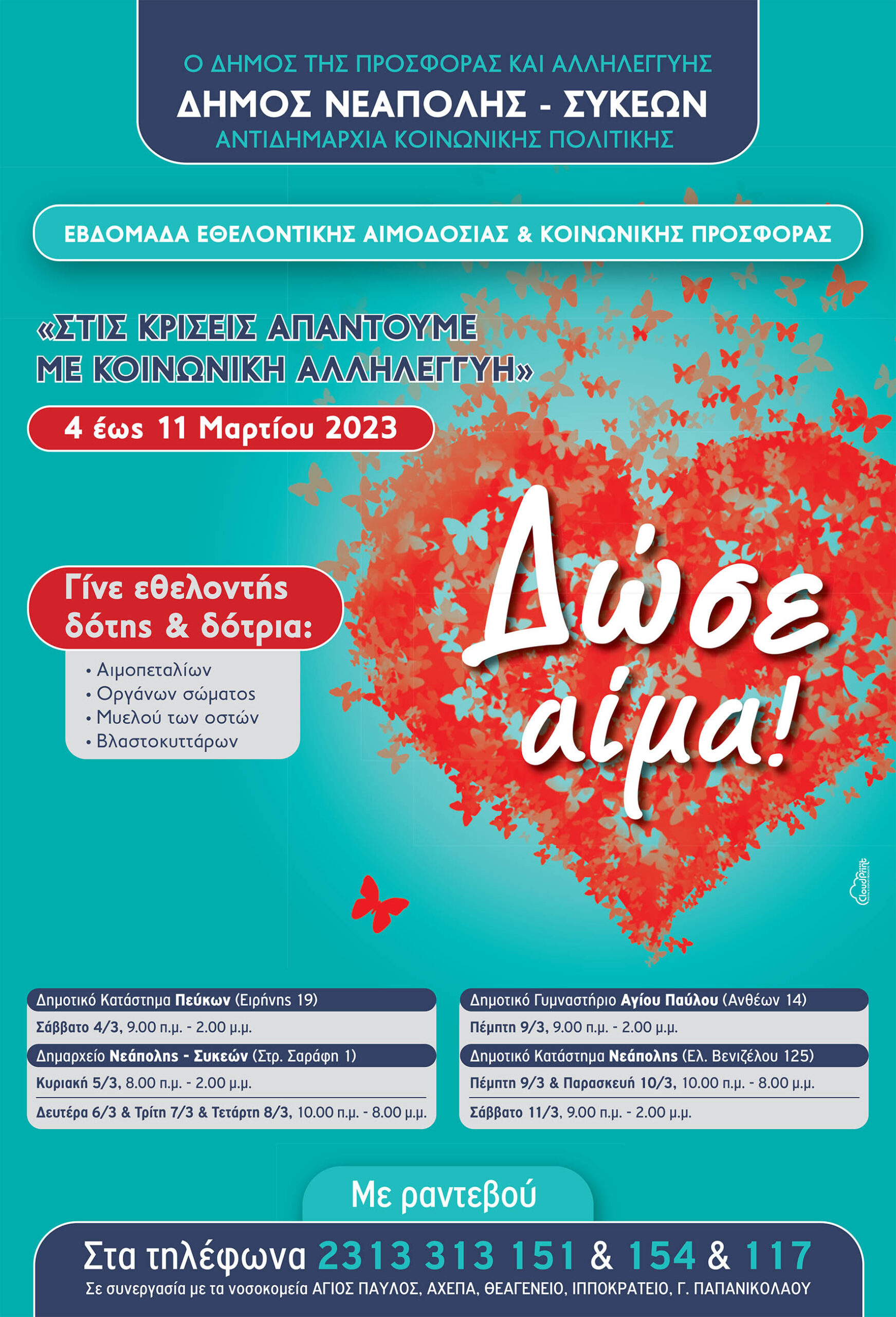 Εθελοντική εβδομάδα αιμοδοσίας στο δήμο Νεάπολης-Συκεών – “Δίνουμε αίμα και για τους τραυματίες των Τεμπών”