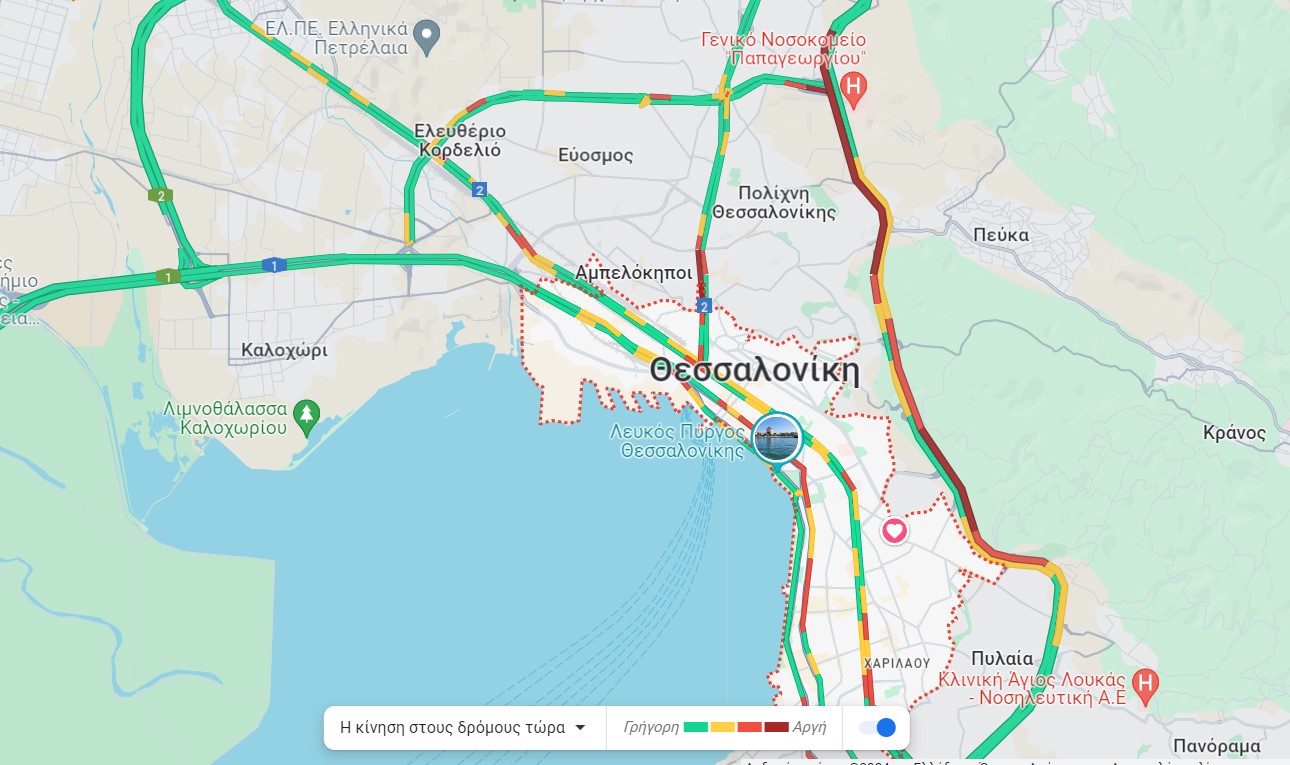 Ειδικότερα, ιδιαίτερα επιβαρυμένο είναι το ρεύμα προς τα ανατολικά στο ύψος των νοσοκομείων Παπαγεωργίου και 424, καθώς και πάνω από τις Συκιές.