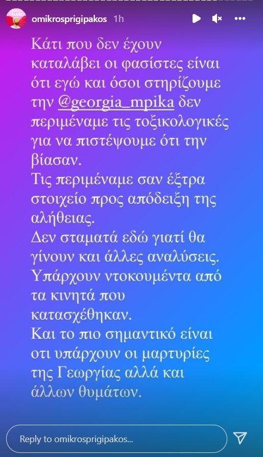 «Κάτι που δεν έχουν καταλάβει οι φασίστες είναι ότι εγώ και όσοι στηρίζαμε την Γεωργία Μπίκα δεν περιμέναμε τις τοξικολογικές για να πιστέψουμε ότι τη βίασαν. Τις περιμέναμε σαν έξτρα στοιχείο προς απόδειξη της αλήθειας. Δεν σταματά εδώ γιατί θα γίνουν και άλλες αναλύσεις. Υπάρχουν ντοκουμέντα από τα κινητά που κατασχέθηκαν. Και το πιο σημαντικό είναι ότι υπάρχουν οι μαρτυρίες της Γεωργίας, αλλά και άλλων θυμάτων».