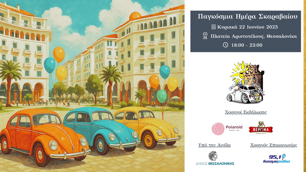 Με αφορμή την Παγκόσμια Ημέρα Σκαραβαίου, γιορτάζουμε την Κυριακή 22 Ιουνίου 2025 στην καρδιά της πόλης, την Πλατεία Αριστοτέλους, με μια μοναδική έκθεση κλασικών Volkswagen Beetle που θα σας ταξιδέψει σε άλλες εποχές!