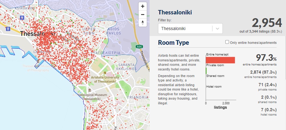 Τι σημαίνει η ανεξέλεγκτη εξάπλωση του φαινομένου AirBnB για την πόλη και τον Δήμο της Θεσσαλονίκης; Τα στοιχεία της βάσης δεδομένων Inside AirBnB (συνεργατικό εγχείρημα που αναδεικνύει τον αντίκτυπο του AirBnB στις κατοικημένες κοινότητες) είναι σοκαριστικά: