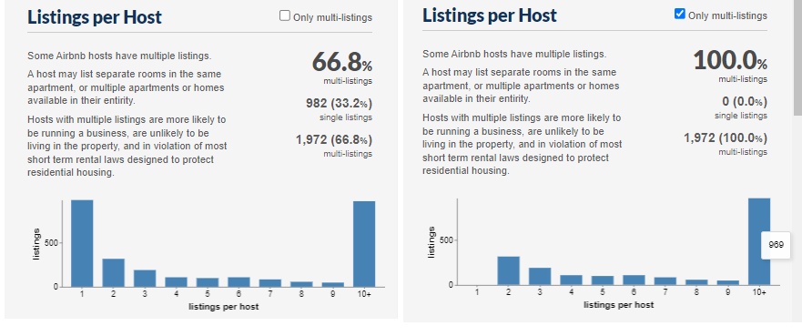 – Τα 2/3 (66,8%) των «οικοδεσποτών» του AirBnB στον Δήμο Θεσσαλονίκης διαθέτουν δύο ή περισσότερα καταχωρισμένα σπίτια, ενώ 969 καταχωρισμένα διαμερίσματα-κατοικίες ανήκουν σε οικοδεσπότες -πολλοί εκ των οποίων αποτελούν επιχειρήσεις/νομικά πρόσωπα (μεσιτικά γραφεία, τουριστικές επιχειρήσεις, κ.ά.) – οι οποίοι διαθέτουν συνολικά 10 ή περισσότερες καταχωρίσεις στο όνομά τους [ΕΙΚΟΝΑ 2]. Οι τρεις hosts με τις περισσότερες καταχωρίσεις διαθέτουν προς βραχυχρόνια μίσθωση 198, 111 και 69 ολόκληρα σπίτια/διαμερίσματα αντίστοιχα!