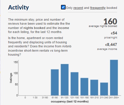– Εάν από τα παραπάνω περίπου 3.000 σπίτια/καταλύματα εξετάσουμε απομονωμένα μόνο όσα έχουν μισθωθεί/αξιολογηθεί πρόσφατα (μέσα στους τελευταίους 6 μήνες) ή νοικιάζονται συχνά, διαπιστώνουμε ότι η μέση διάρκεια κράτησης είναι 160 (!) ημέρες, με μέση χρέωση 54 ευρώ/διανυκτέρευση, και κάθε καταχωρισμένο σπίτι αποφέρει στον ιδιοκτήτη-host εισόδημα ύψους 8.447 ευρώ ετησίως κατά μέσο όρο [ΕΙΚΟΝΑ 3]. Η συχνότητα και η μέση διάρκεια ενοικίασης, σε συνδυασμό με τα υψηλά κέρδη που αποφέρει η βραχυχρόνια μίσθωση μέσω AirBnB, καταδεικνύουν ότι η τρέχουσα κατάσταση δημιουργεί στους ιδιοκτήτες ακίνητης περιουσίας πολύ μεγαλύτερο κίνητρο για βραχυχρόνιες μισθώσεις για τουριστικούς λόγους από ό,τι για μακροχρόνιες μισθώσεις των σπιτιών ως κατοικίες που εξυπηρετούν τις ανάγκες των μόνιμων κατοίκων, συμπεριλαμβανομένου του φοιτητικού πληθυσμού της πόλης, ο οποίος εκτοπίζεται έτσι σε παρακείμενους Δήμους, απομακρυσμένους από τη δουλειά ή τους χώρους φοίτησης, φτάνοντας σε κάποιες περιπτώσεις ακόμη και σε αποχώρηση από την ευρύτερη περιοχή της Θεσσαλονίκης.