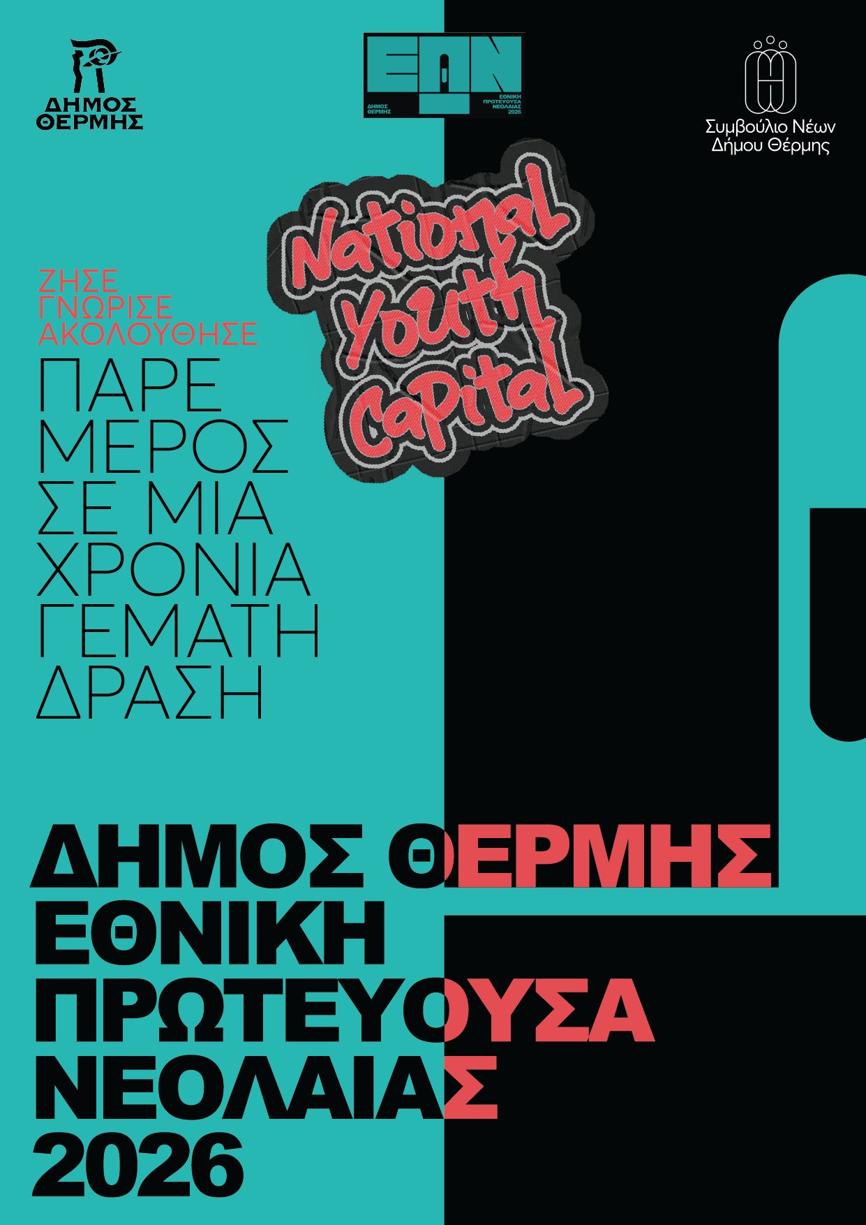 Με όραμα τη δημιουργία ενός Δήμου που ακούει, ενδυναμώνει και συνδιαμορφώνει πολιτικές μαζί με τους νέους, ο Δήμος Θέρμης αναλαμβάνει τον θεσμό της «Εθνικής Πρωτεύουσας Νεολαίας 2026», φιλοδοξώντας να μετατρέψει το 2026 σε χρονιά-ορόσημο για τη συμμετοχή, την καινοτομία και τις ευκαιρίες των νέων ανθρώπων της περιοχής – και όχι μόνο.