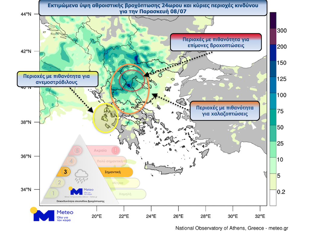 Σύμφωνα με τα νεότερα προγνωστικά στοιχεία του Εθνικού Αστεροσκοπείου Αθηνών / meteo.gr, σημαντική επιδείνωση του καιρού αναμένεται σταδιακά από τα δυτικά και βόρεια της χώρας την Παρασκευή 08/07 και η οποία αναμένεται να συνεχιστεί και κατα τη διάρκεια του Σαββάτου 09/07 με βροχές και τοπικά ισχυρές καταιγίδες. Το αναμενόμενο επεισόδιο βροχόπτωσης είναι Κατηγορίας 3 σύμφωνα με τον Δείκτη Επικινδυνότητας Επεισοδίου Βροχόπτωσης (Regional Precipitation Index – RPI) που έχει αναπτυχθεί και εφαρμόζεται επιχειρησιακά στο Εθνικό Αστεροσκοπείο Αθηνών / meteo.gr. Τα κύρια χαρακτηριστικά αυτής της κακοκαιρίας κατα την διάρκεια της Παρασκευής 08/07 είναι: