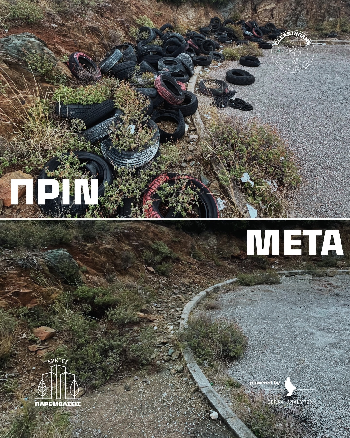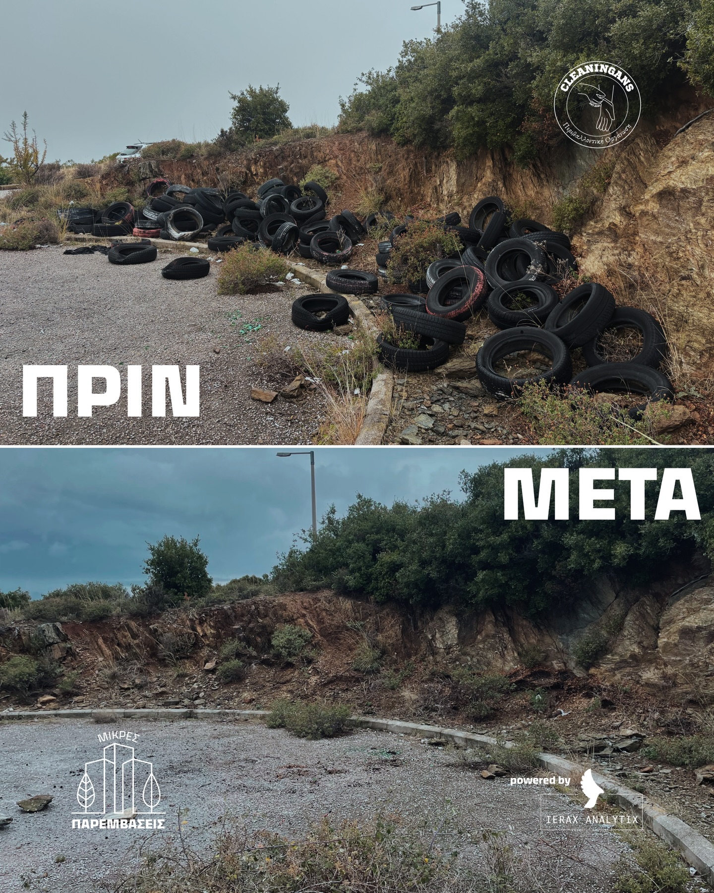 Σε αυτό το ζοφερό σκηνικό, όμως, εμφανίζονται οι εθελοντές. Οι Cleaningans, αναλαμβάνοντας πρωτοβουλίες που θα έπρεπε να αναλάβουν οι δήμοι, αφιέρωσαν χρόνο και προσπάθεια για να καθαρίσουν τον χώρο και να απομακρύνουν εκατοντάδες παλιά ελαστικά. Η ποσότητα των απορριμμάτων κάλυψε σχεδόν ένα ολόκληρο φορτηγό και ήταν ορατή ακόμη και μέσω δορυφορικών χαρτών, ένδειξη της χρόνιας αδιαφορίας και της εγκατάλειψης που χαρακτηρίζει την περιοχή.