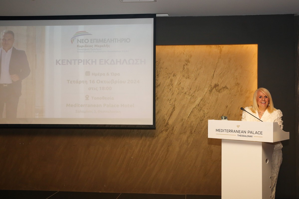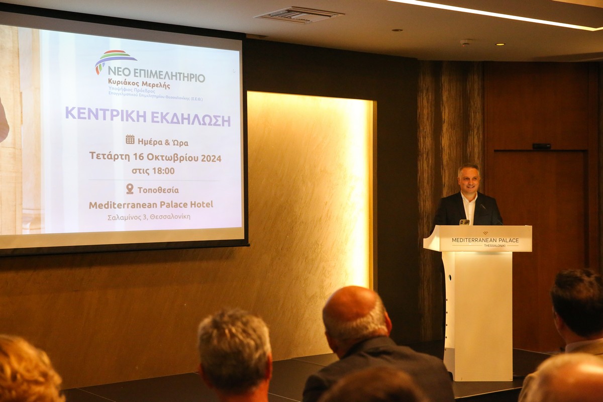 Σε μια κατάμεστη αίθουσα, παρουσία των υποψηφίων του συνδυασμού, ανθρώπων της αγοράς, βουλευτών, δημάρχων, προέδρων εμπορικών συλλόγων και επαγγελματικών σωματείων του νομού Θεσσαλονίκης, εκπροσώπων εργαζομένων και αιρετών, ο υποψήφιος πρόεδρος του Επαγγελματικού Επιμελητηρίου Θεσσαλονίκης Κυριάκος Μερελής παρουσίασε το πρόγραμμα του συνδυασμού ενόψει των εκλογών του Νοεμβρίου.