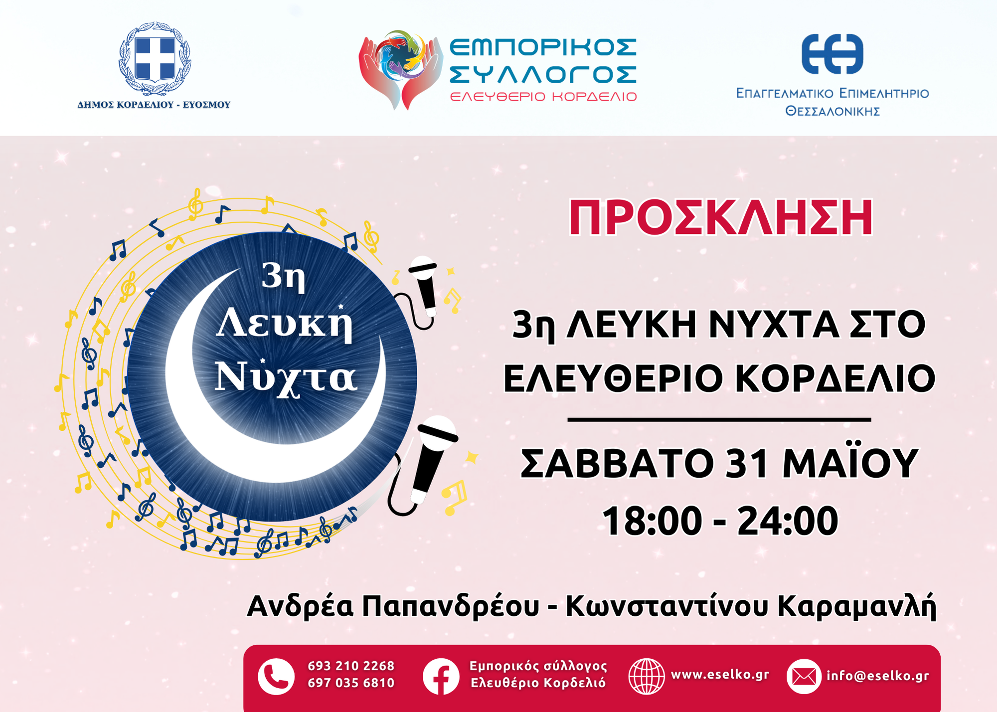 Το Σάββατο 31 Μαΐου, από τις 6:00 το απόγευμα μέχρι τις 12:00 τα μεσάνυχτα, θα πραγματοποιηθεί η Λευκή Νύχτα στην δημοτική ενότητα Ελευθερίου – Κορδελιού του Δήμου Κορδελιού – Ευόσμου. Τη γιορτή της αγοράς αλλά και όλων των κατοίκων, η οποία θα περιλαμβάνει χορό, τραγούδι και εκπλήξεις για μικρούς και μεγάλους, διοργανώνει ο Εμπορικός Σύλλογος Ελευθερίου – Κορδελιού, με συνδιοργανωτές τον Δήμο Κορδελιού – Ευόσμου και το Επαγγελματικό Επιμελητήριο Θεσσαλονίκης.