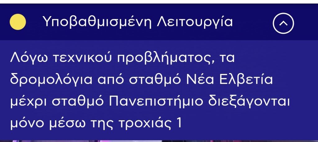 Το site του Μετρό Θεσσαλονίκης μιλά για υποβαθμισμένη λειτουργία. “Λόγω τεχνικού προβλήματος, τα δρομολόγια από σταθμό Νέα Ελβετία μέχρι σταθμό Πανεπιστήμιο διεξάγονται μόνο μέσω της τροχιάς 1” αναφέρει χαρακτηριστικά.