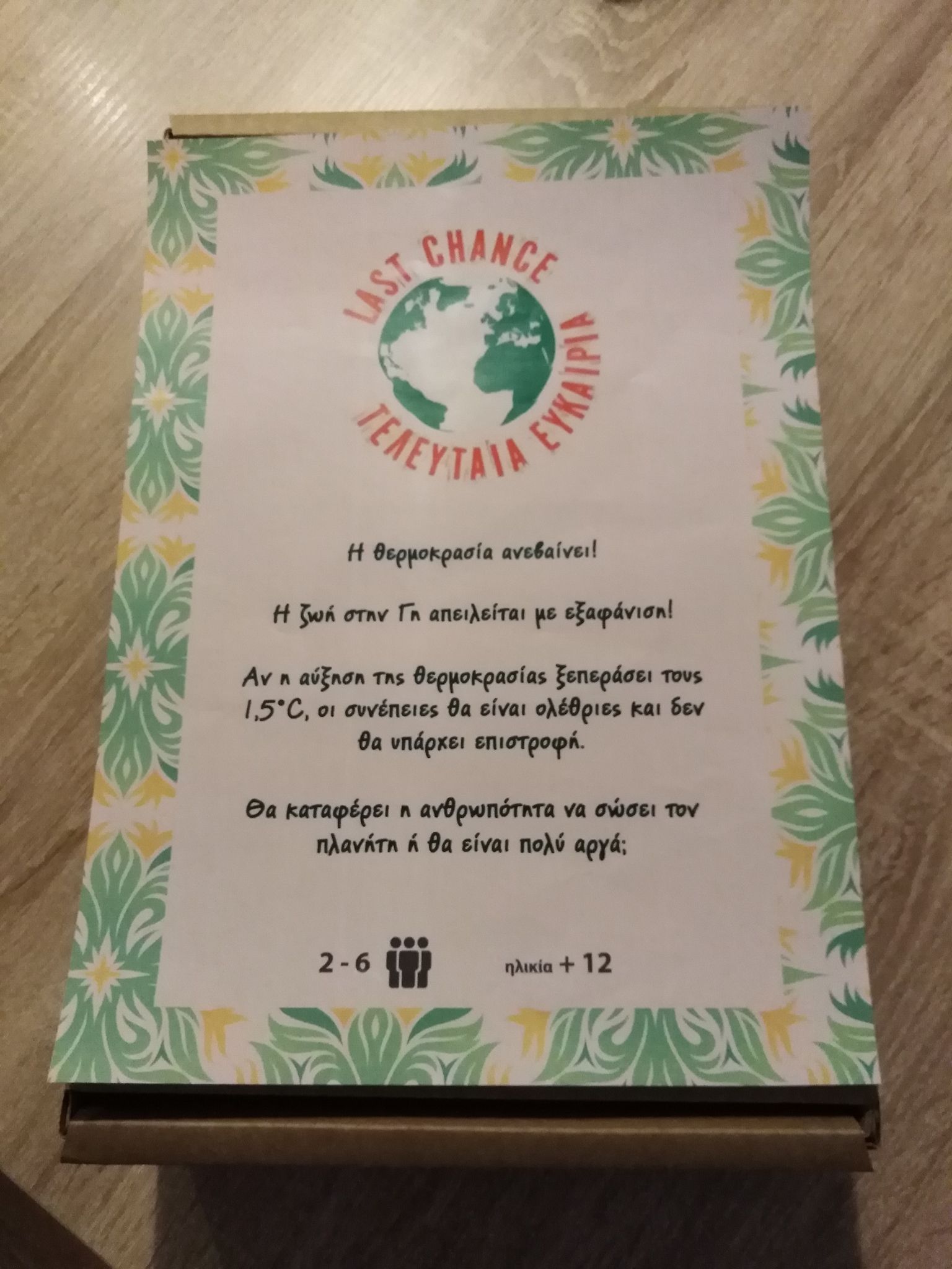 Οι ηγέτιδες/τες των ηπείρων πρέπει να καταπολεμήσουν την κλιματική αλλαγή, υλοποιώντας αρκετές περιβαλλοντικές δράσεις ώστε να περιορίσουν την άνοδο της θερμοκρασίας, στους +1,5 Κελσίου και να προστατεύσουν την βιοποικιλότητα του πλανήτη χωρίς όμως να καταρρεύσει η οικονομία τους. Οι επιστήμονες διαπίστωσαν ότι ο στόχος των +1,5 Κελσίου είναι ο πιο ρεαλιστικός κι αυτός με τις πιο διαχειρίσιμες συνέπειες. Το παιχνίδι μπορεί να έχει από 2 έως 6 παίχτες, ηλικίας άνω των 12 ετών. Ανάλογα με τον αριθμό των συμμετεχόντων αλλάζει το χρηματικό ποσό που δίνεται σε κάθε παίχτη. Στο συγκεκριμένο παιχνίδι ή ΟΛΟΙ κερδίζουν ή ΟΛΟΙ χάνουν! Είναι η τελευταία ευκαιρία!