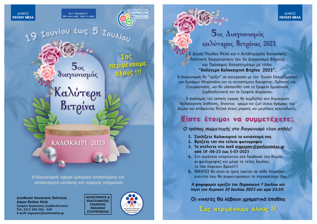 Την «Καλύτερη καλοκαιρινή βιτρίνα 2023» αναζητούν ο δήμος Παύλου Μελά και η Αντιδημαρχία Κοινωνικής Πολιτικής, καθώς διοργανώνεται ο 5ος Διαγωνισμό Βιτρίνας και Πρόσοψης Καταστημάτων.