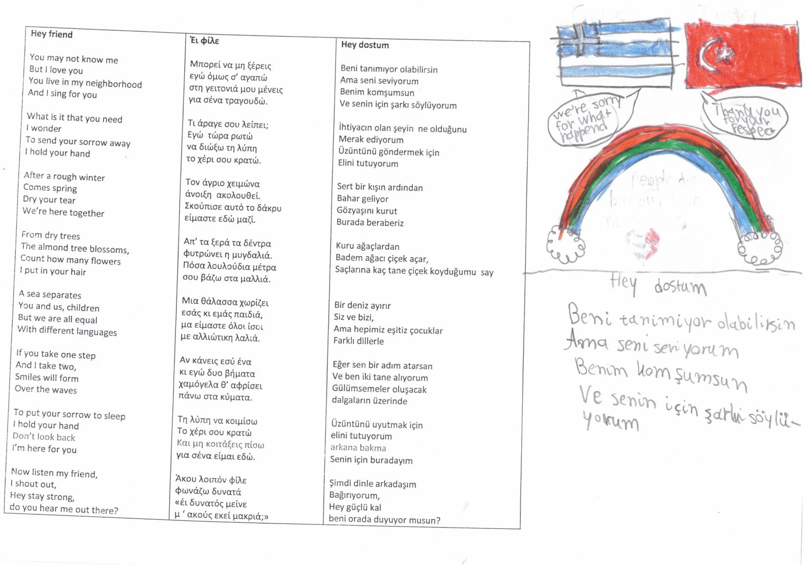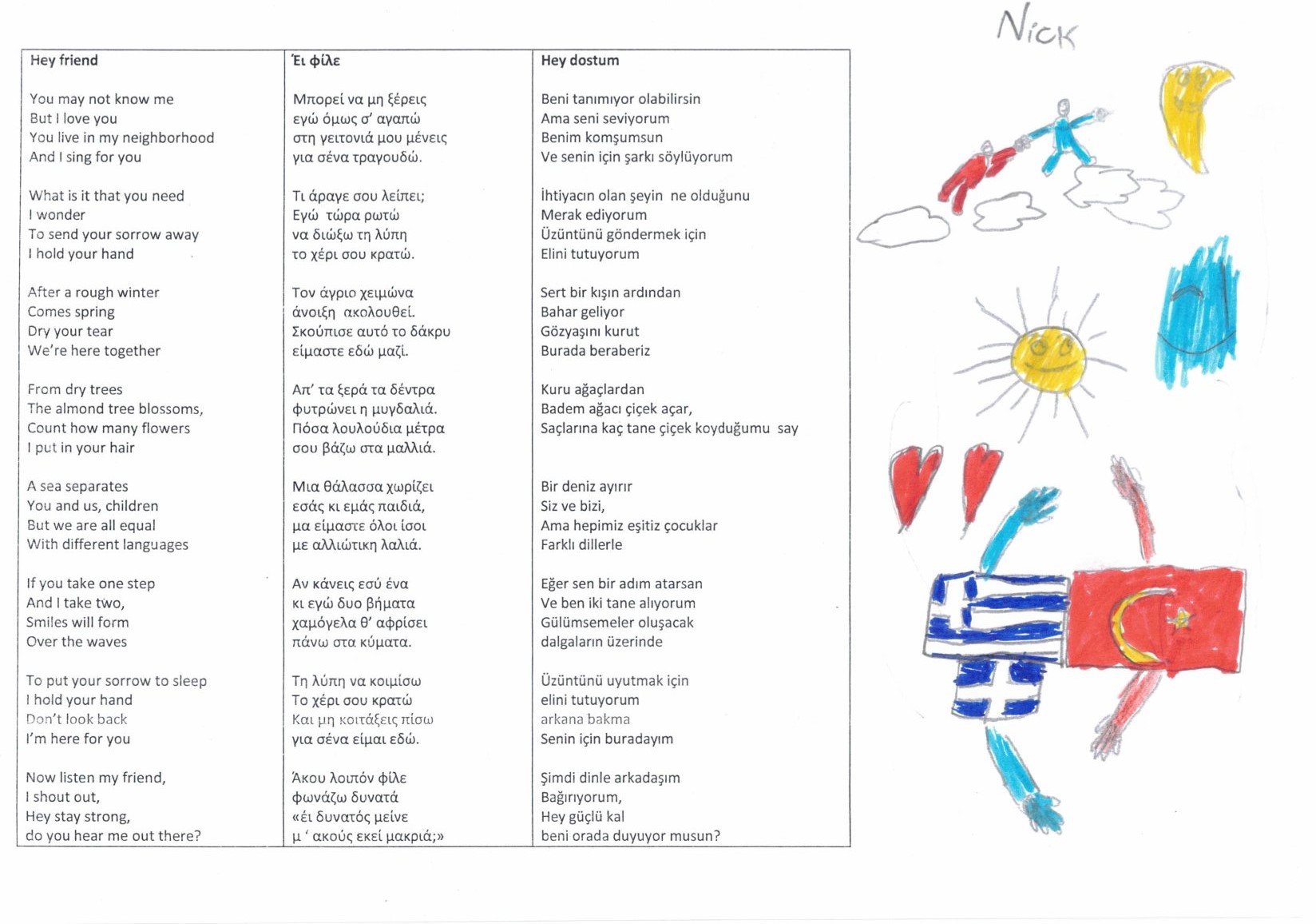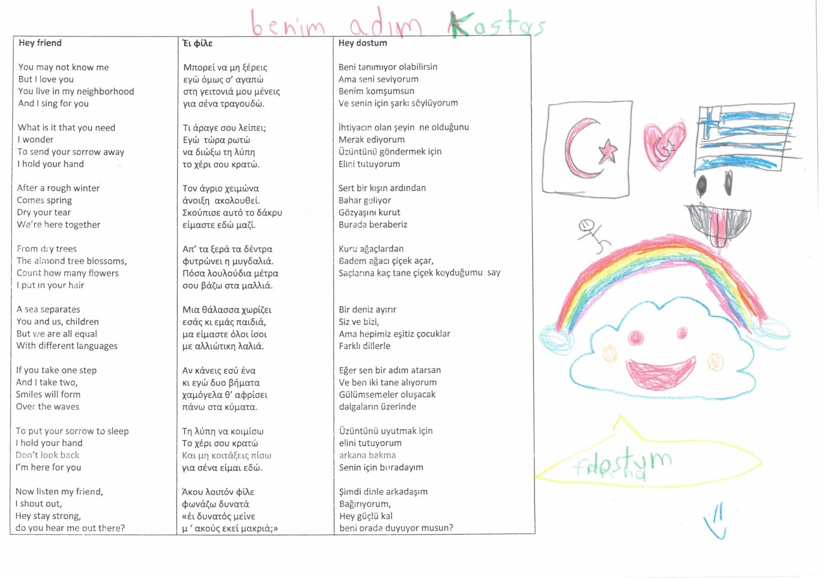 Οι μαθήτριες και οι μαθητές του τμήματος Δ1 του 1ου Δημοτικού Σχολείου Παλαιοκάστρου έγραψαν στίχους και τους έκαναν τραγούδι το οποίο μετέφρασαν στην αγγλική και την τουρκική γλώσσα.