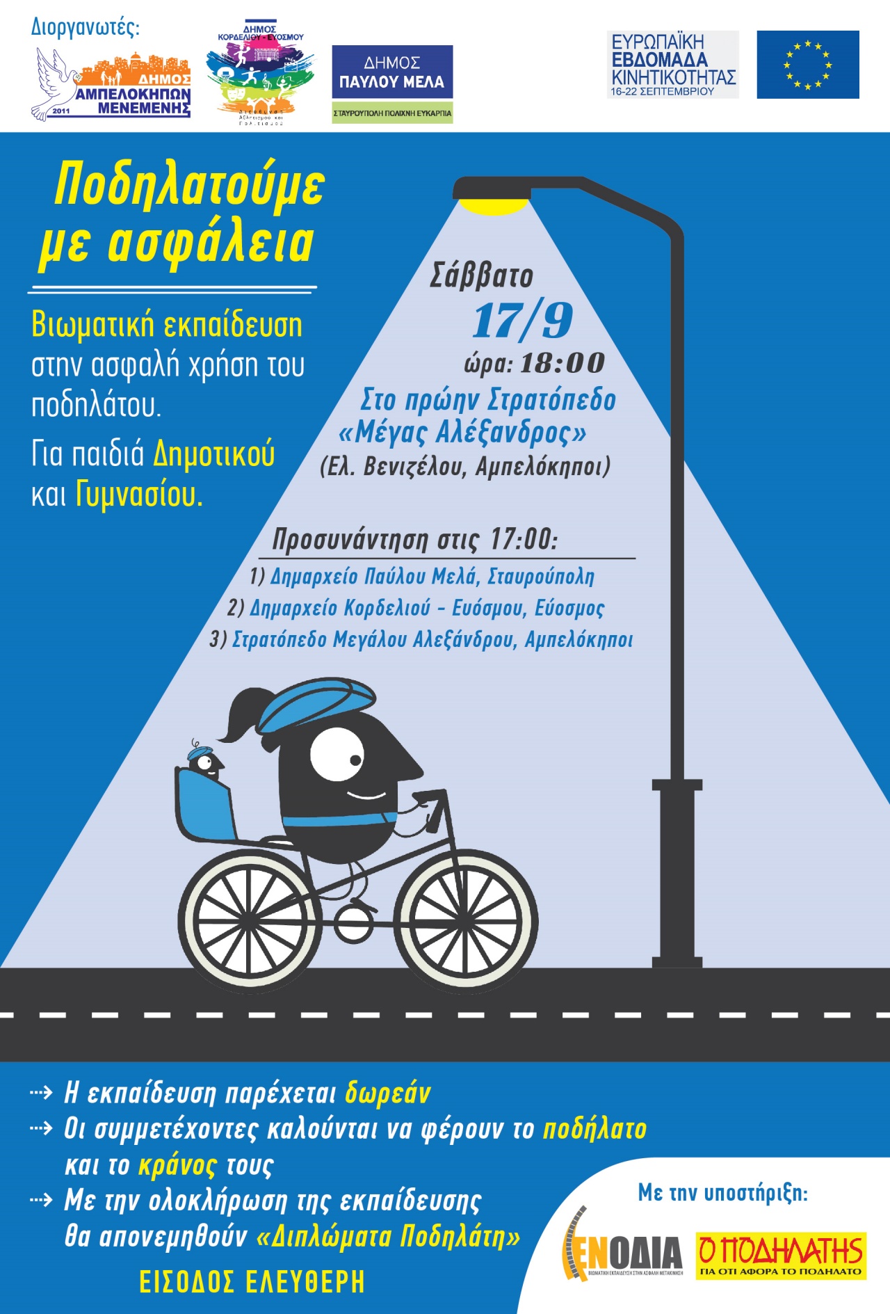 Ποδηλατοβόλτα για μικρούς και μεγάλους, διοργανώνουν οι δήμοι Αμπελοκήπων – Μενεμένης, Παύλου Μελά και Κορδελιού – Ευόσμου στο πλαίσιο της Ευρωπαϊκής Εβδομάδας Κινητικότητας.