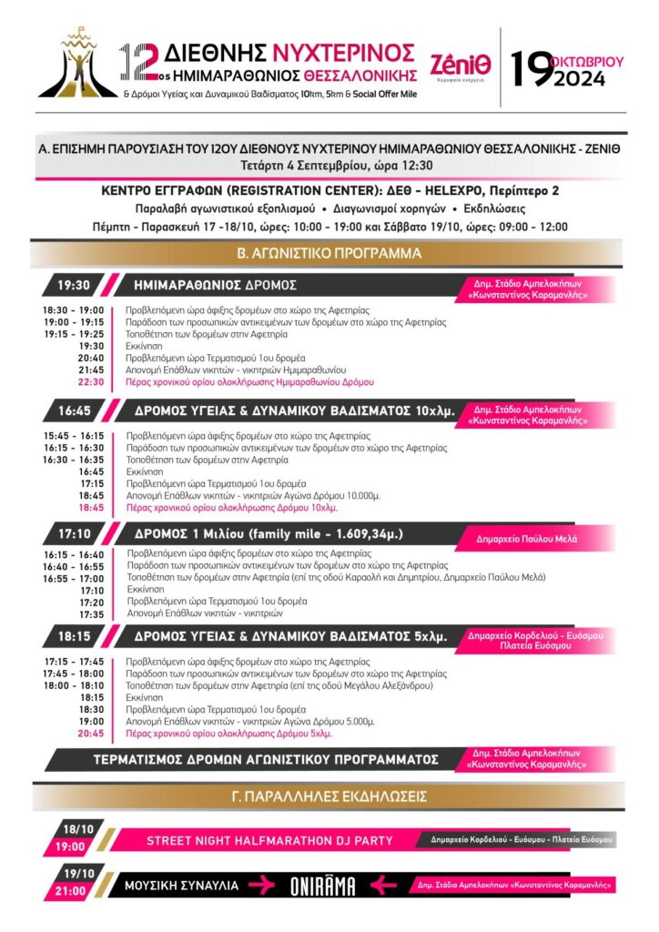Το αγωνιστικό πρόγραμμα της διοργάνωσης, περιλαμβάνει τον Ημιμαραθώνιο δρόμο (ώρα άφιξης δρομέων 18.30) με αφετηρία το Δημοτικό Στάδιο Αμπελοκήπων «Κωνσταντίνο Καραμανλής», τον Δρόμο Υγείας & Δυναμικού Βαδίσματος 10.000 μ. (ώρα άφιξης δρομέων 15.45) με αφετηρία το Δημοτικό Στάδιο Αμπελοκήπων «Κωνσταντίνος Καραμανλής».