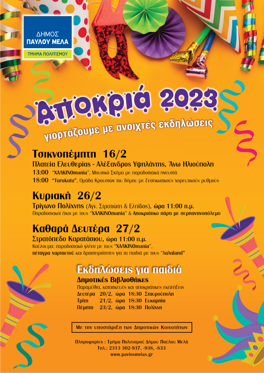 Οι αποκριές πλησιάζουν κι ο δήμος Παύλου Μελά προετοιμάζεται για να γιορτάσει με εκδηλώσεις που θα γίνουν σε ανοιχτούς χώρους του Δήμου και στις Δημοτικές Δανειστικές Βιβλιοθήκες.