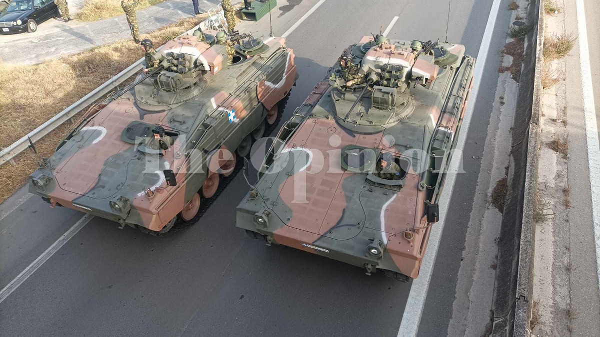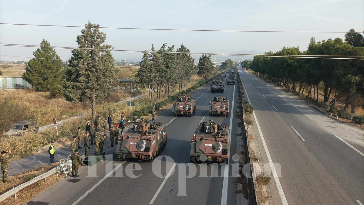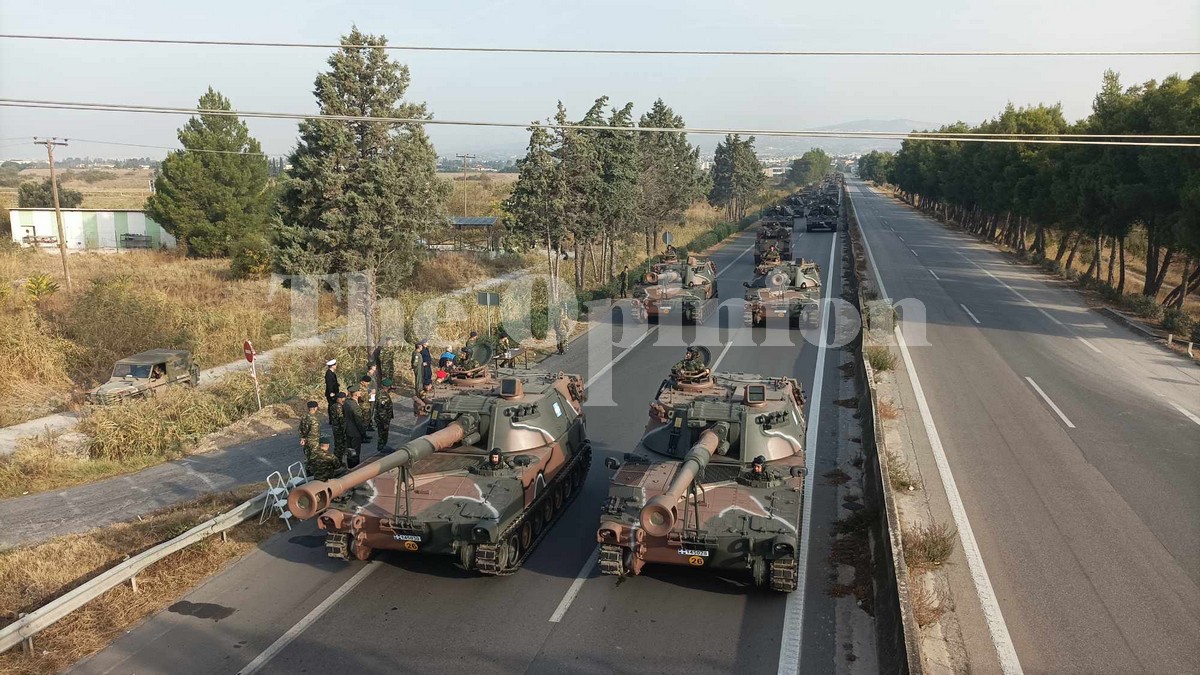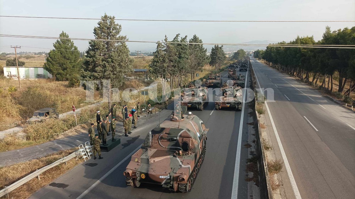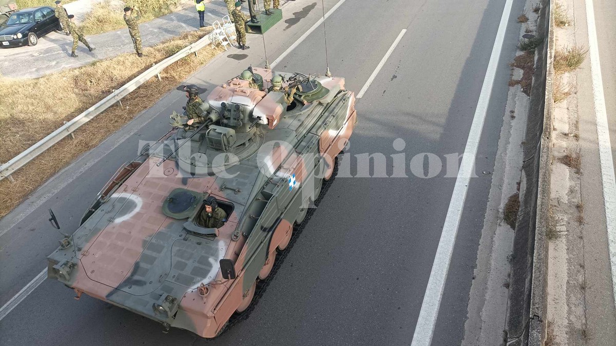 Μηχανοκίνητα τμήματα του στρατού παρελαύνουν από το πρωί στην Μουδανιών, στο τμήμα της από τη νέα αερογέφυρα Θέρμης μέχρι την αερογέφυρα Ρυσίου.