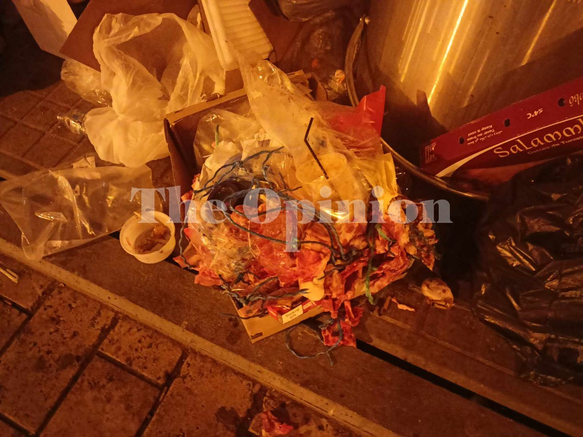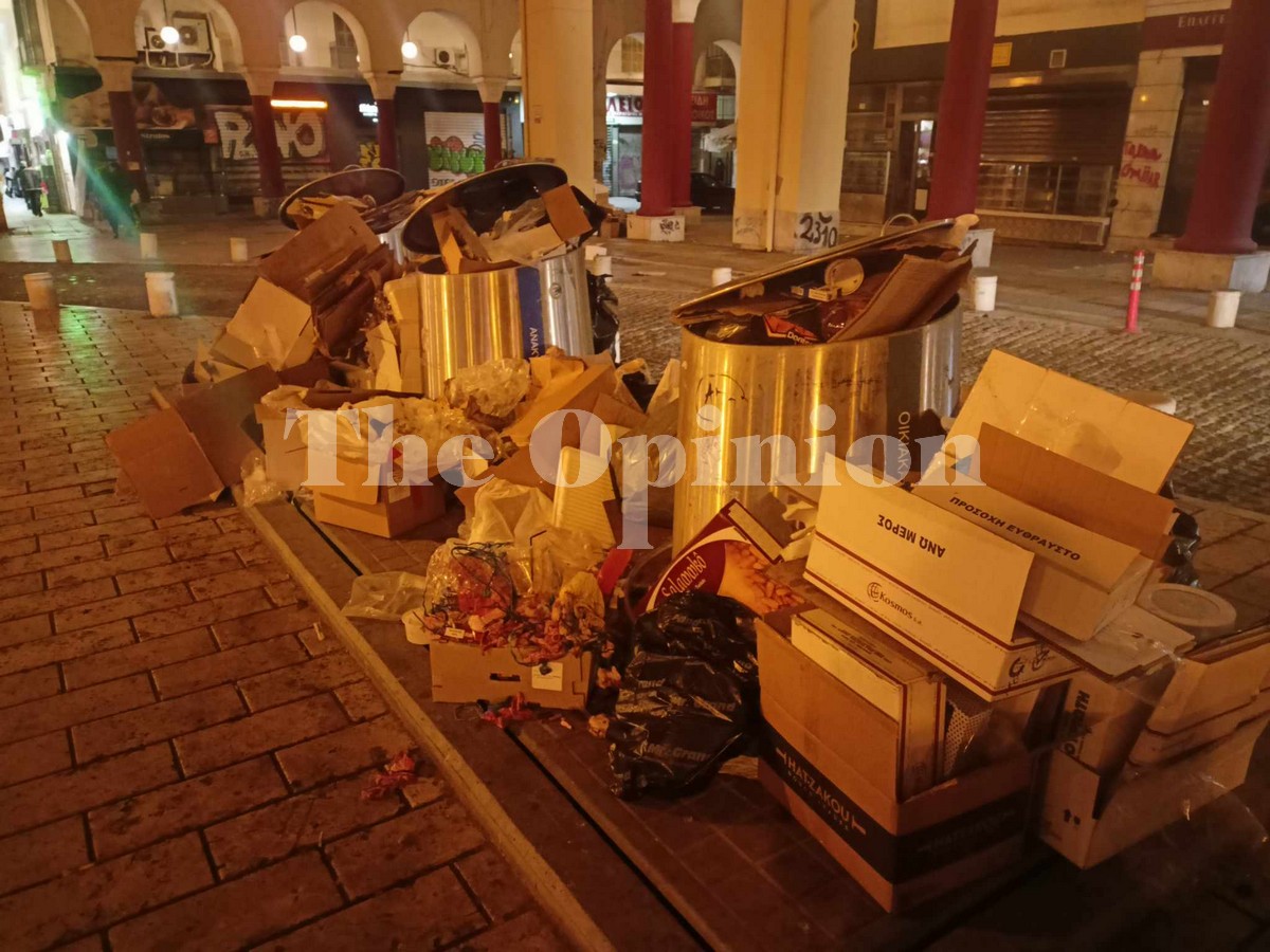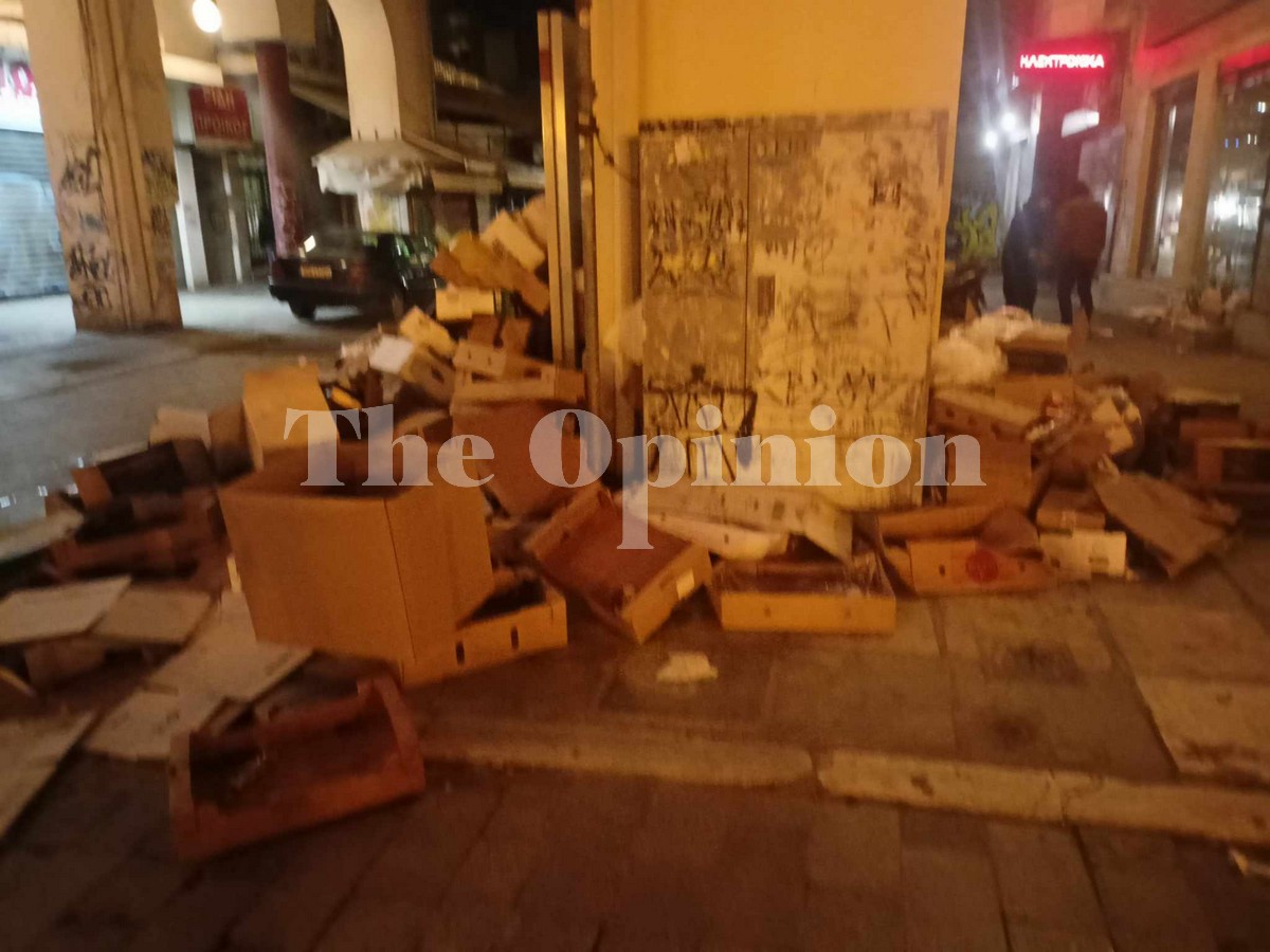 Πεταμένα κουτιά, τελάρα, ξεχειλισμένοι υπόγειοι κάδοι ακόμα και πεταμένα κρέατα αντικρίζει όποιος περνά το βράδυ της Παρασκευής, από το πιο κεντρικό σημείο της πόλης, την πλατεία Αριστοτέλους.