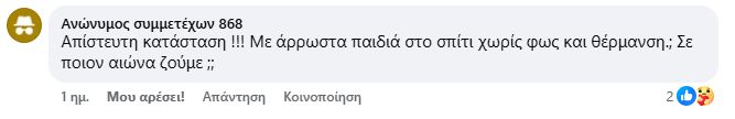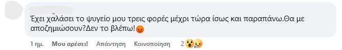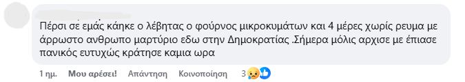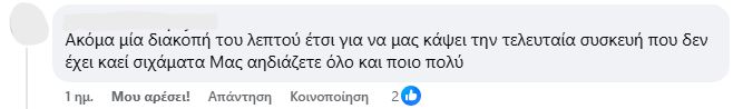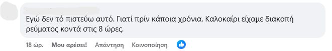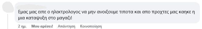 «Δεν είναι δυνατόν με την παραμικρή μεταβολή του καιρού να έχουμε πολύωρες διακοπές ρεύματος. Ρίχνει λίγη βροχή και τρέχουμε πανικόβλητοι να βγάλουμε τις συσκευές μας από τις πρίζες», θα σχολιάσει. «Ο γείτονάς μου πέρσι άλλαξε όλες τις συσκευές του. Εγώ προς το παρόν δεν είχα ανάλογη εμπειρία, ωστόσο το τελευταίο εξάμηνο δουλεύω εξ αποστάσεως με αποτέλεσμα να μην μπορώ να ανταπεξέλθω στη δουλειά μου. Έχουμε αρχίσει να σκεφτόμαστε ότι πρέπει να φύγουμε από εδώ και είναι κρίμα γιατί είναι μία πολύ όμορφη και προικισμένη περιοχή», αναφέρει σε άλλο σημείο.