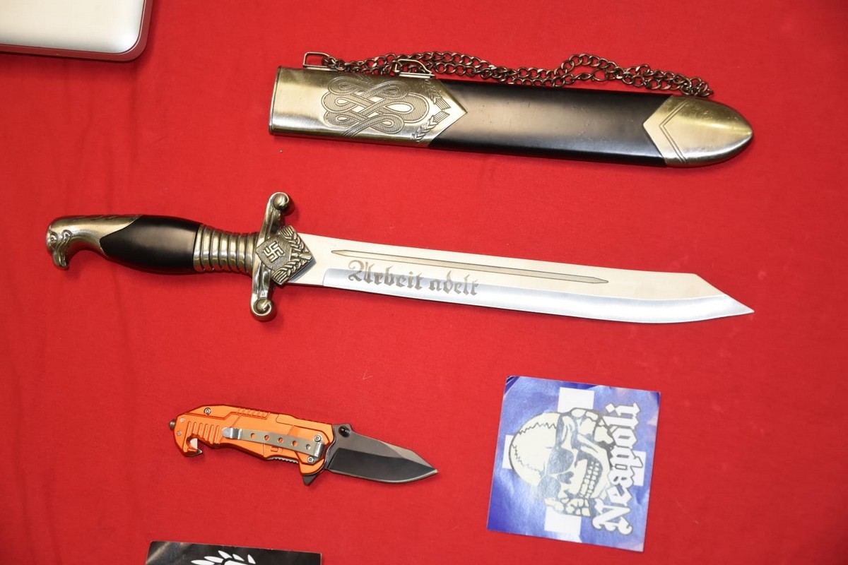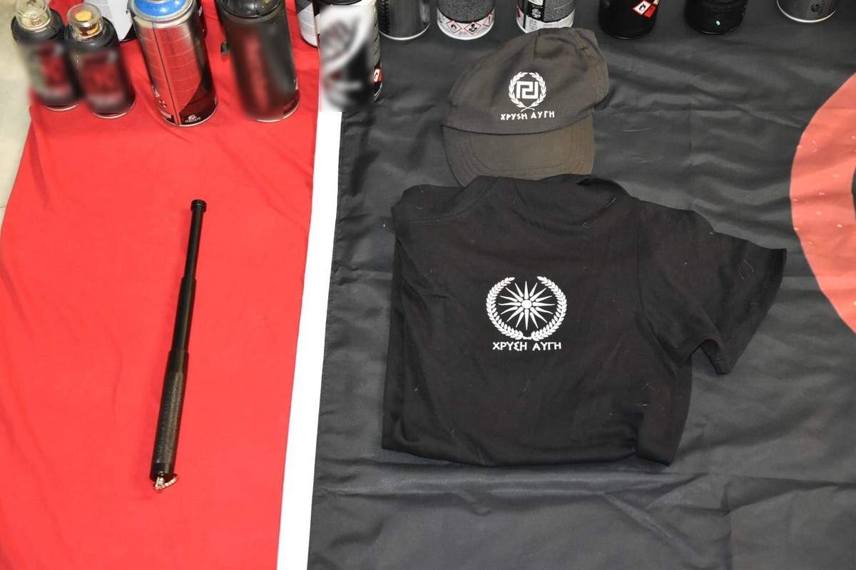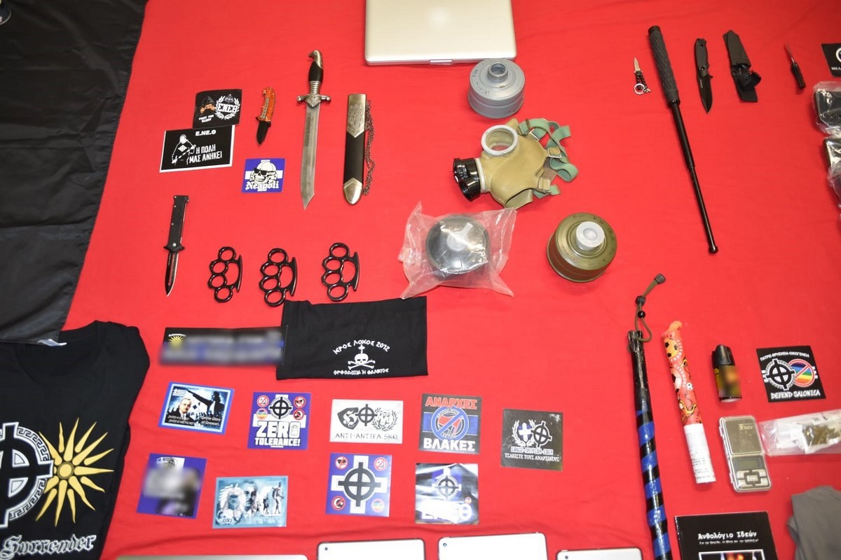 Ναζιστικά σύμβολα, σιδηρογροθιές, μαχαίρια και άλλα αντικείμενα εντοπίστηκαν από την αστυνομία στο πλαίσιο της επιχείρησης εξάρθρωσης της πολυμελούς εγκληματικής οργάνωσης, που δρούσε υπό τον μανδύα ακροδεξιάς συλλογικότητας.