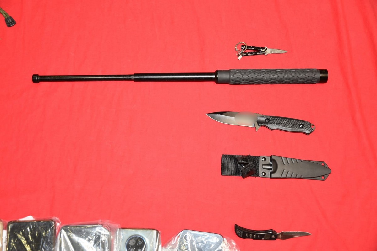 πλήθος οπλισμού (σιδηρογροθιές, μαχαίρια, σπαθί, μεταλλικές και ξύλινοι ράβδοι, κυνηγετικά φυσίγγια, σφεντόνα και πυροτεχνική κατασκευή), δύο συσκευασίες περιέχουσες κάνναβη, 1 ζυγαριά ακριβείας, 33 συσκευές κινητών τηλεφώνων, 6 ηλεκτρονικοί υπολογιστές και 2 αντιασφυξιογόνες μάσκες.