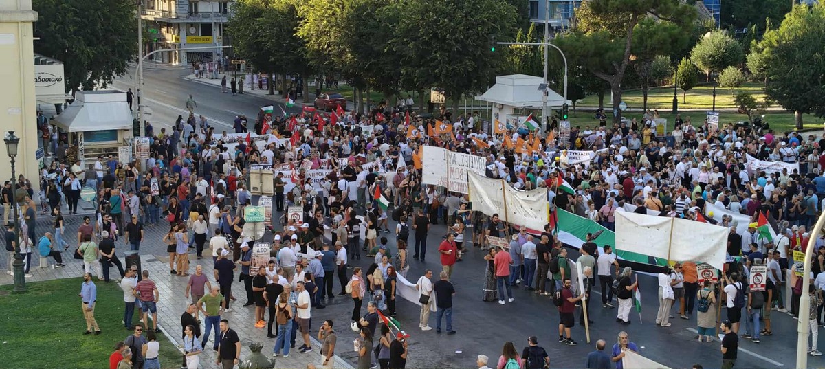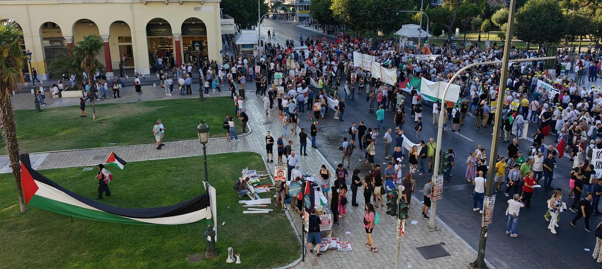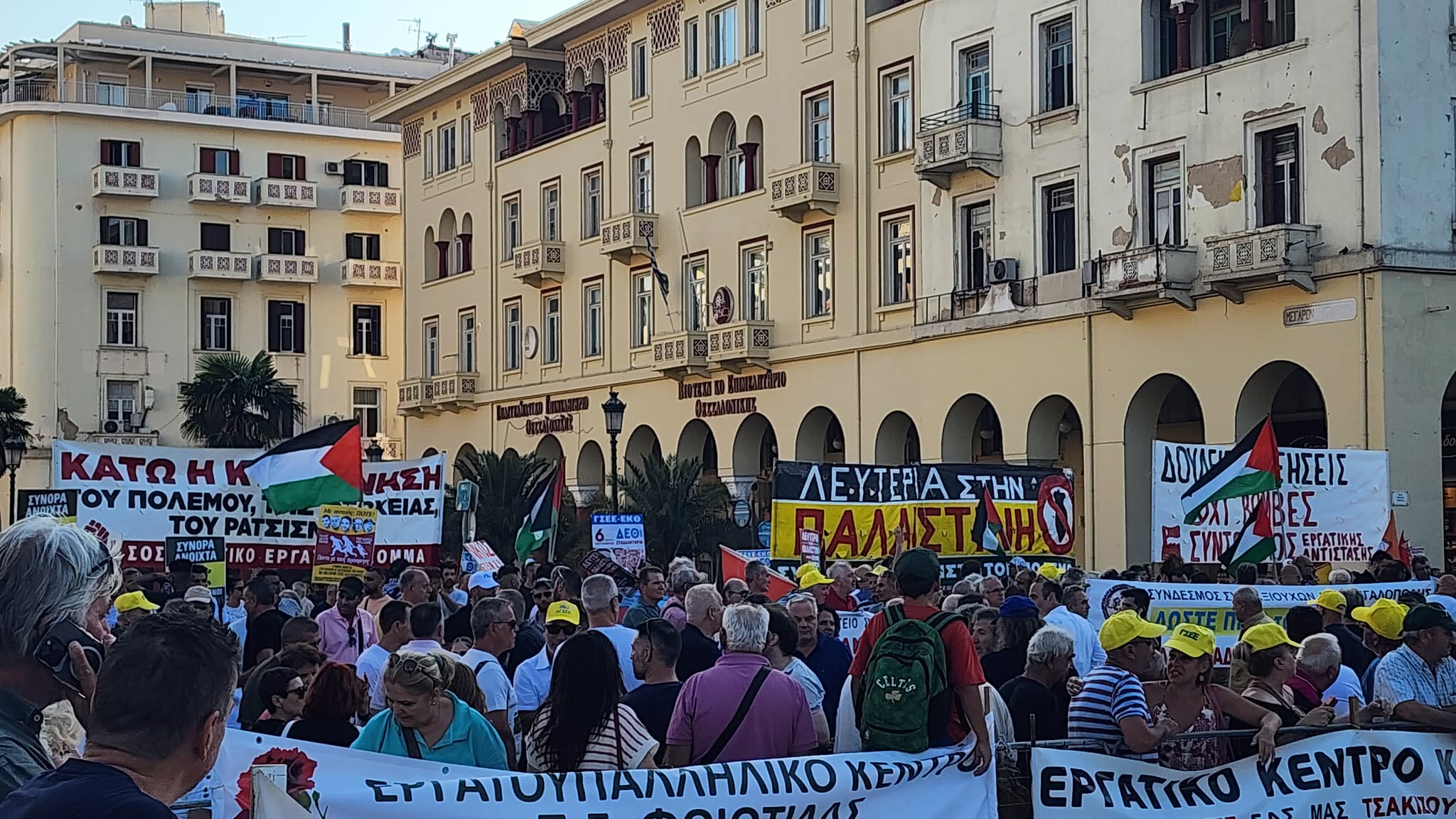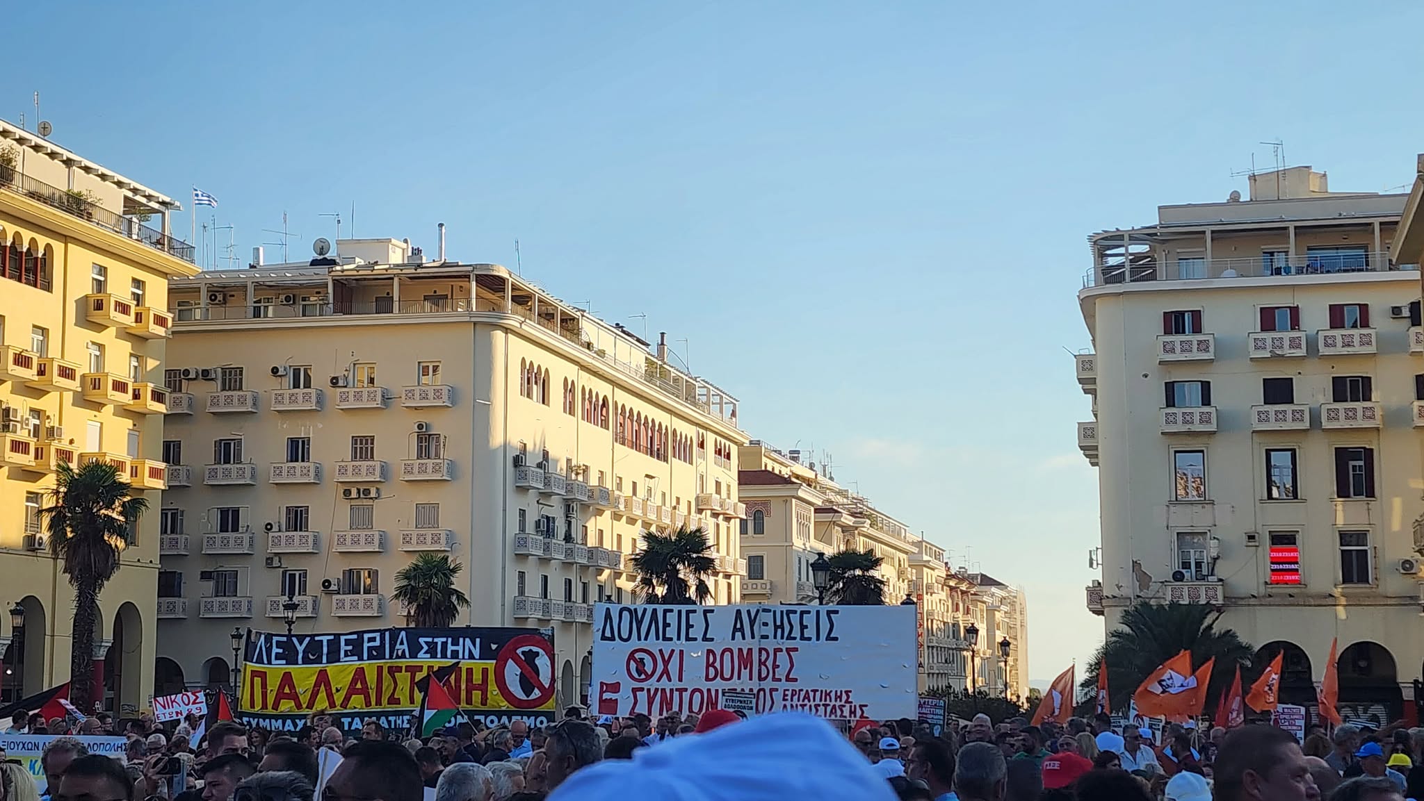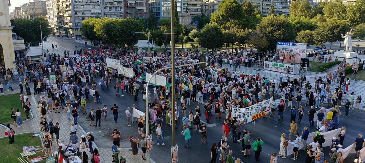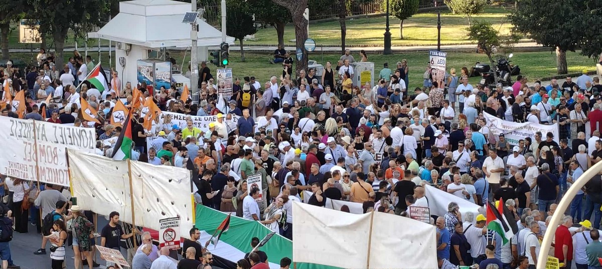 Συγκέντρωση διαμαρτυρίας και πορεία εργατικών σωματείων έλαβε χώρα στην πλατεία Αριστοτέλους το απόγευμα του Σαββάτου ενώ ακούστηκαν και συνθήματα υπέρ της Παλαιστίνης.