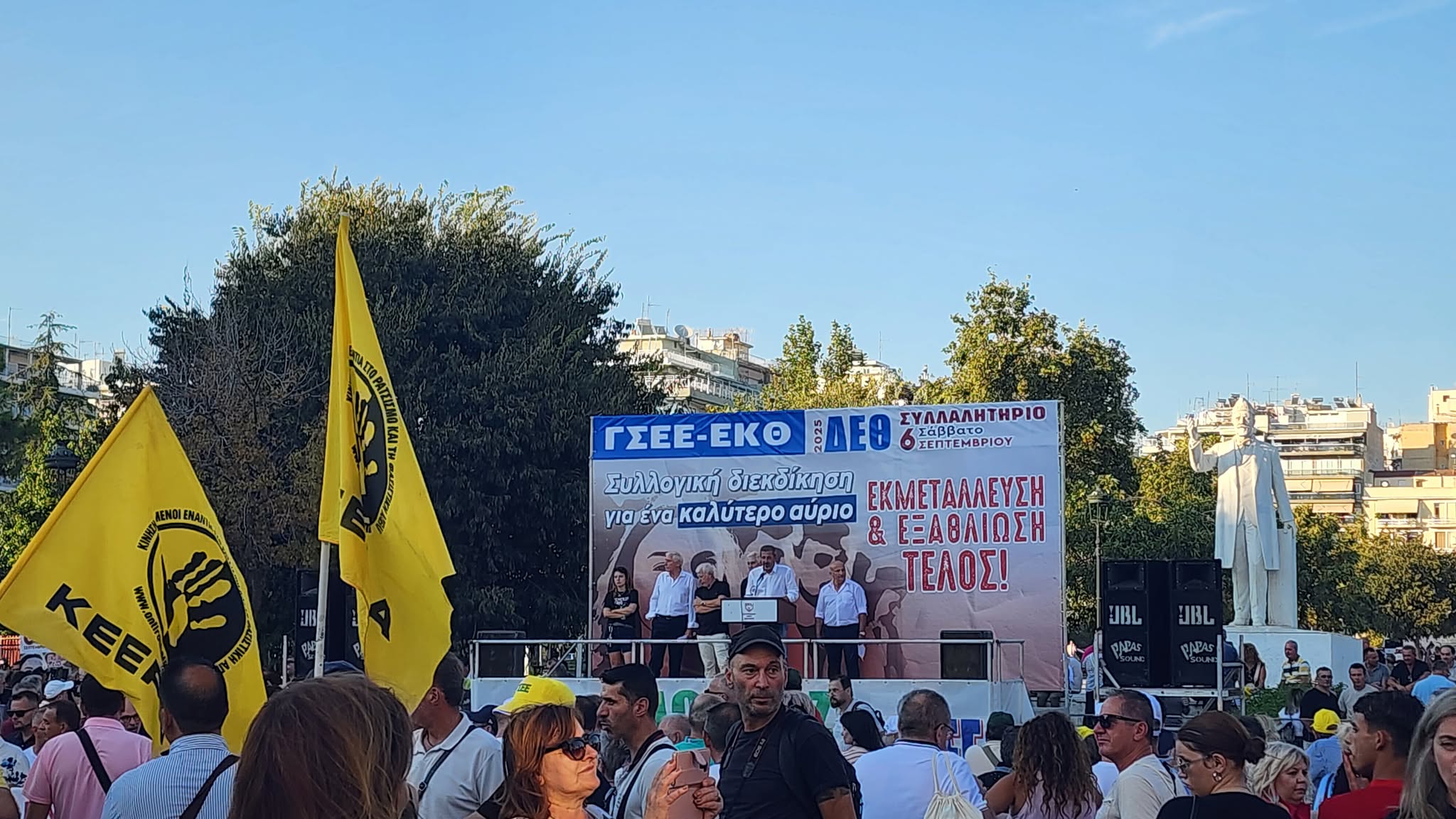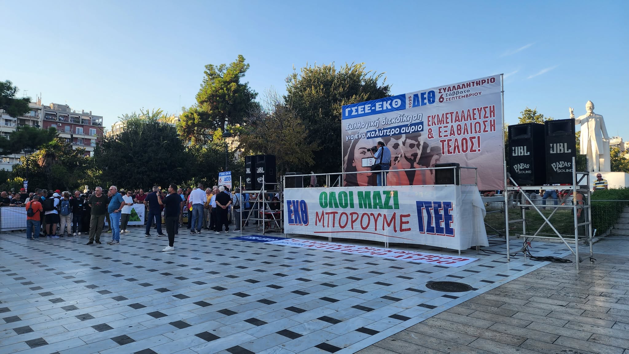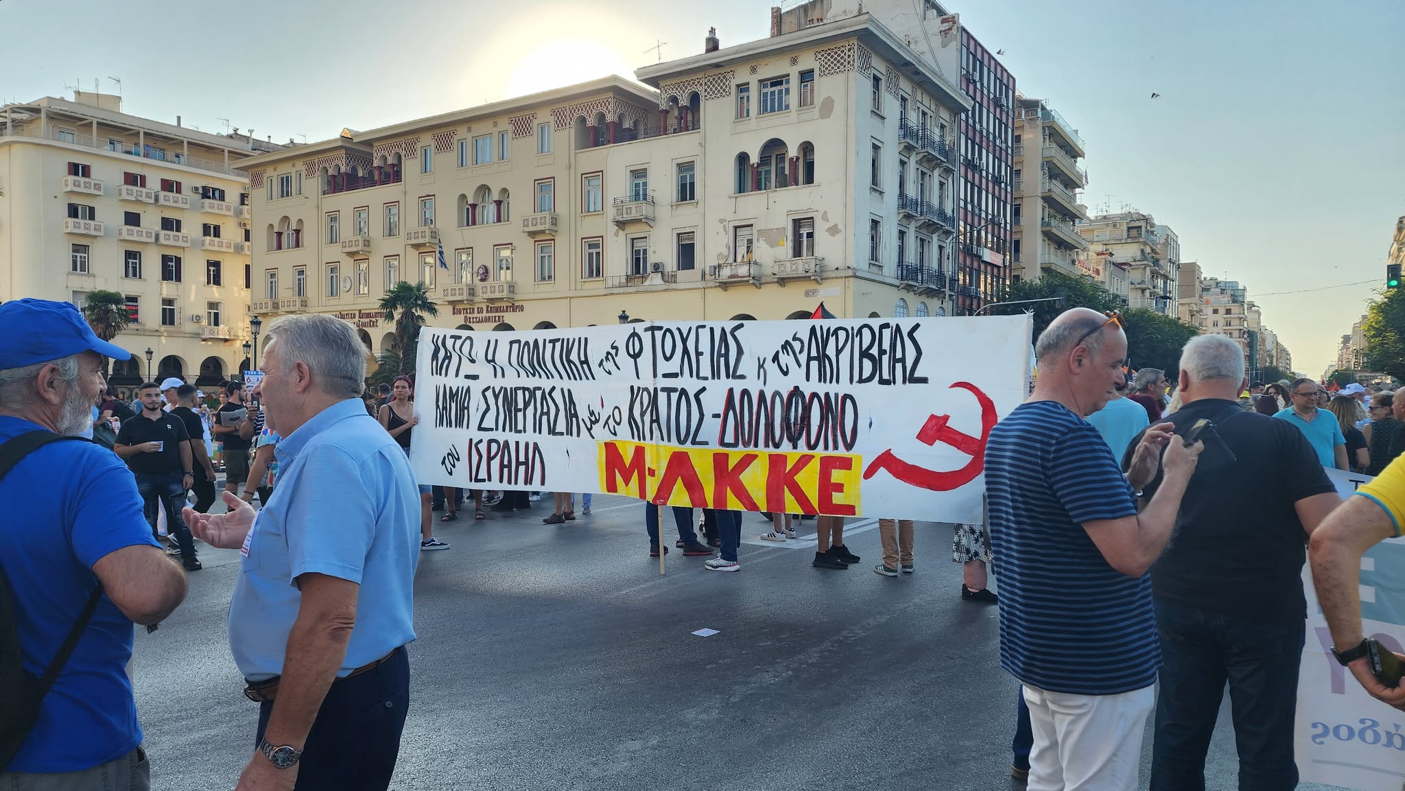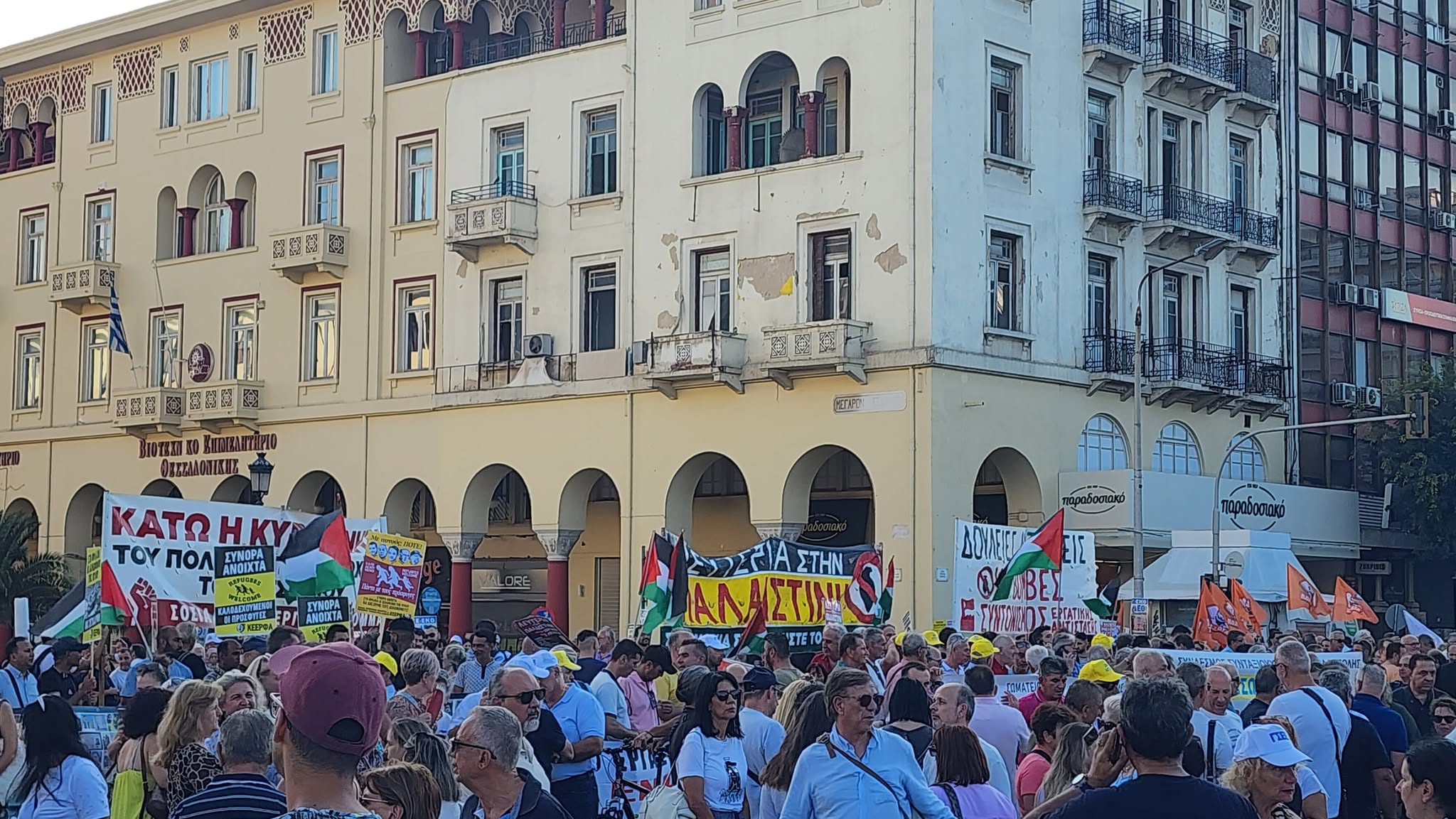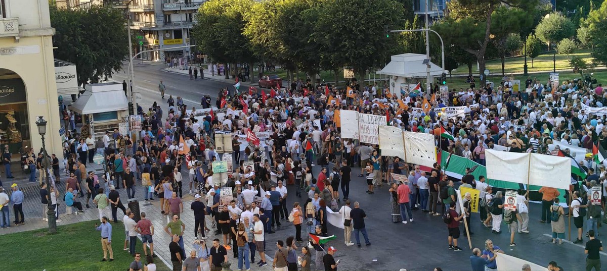 Συγκέντρωση διαμαρτυρίας και πορεία εργατικών σωματείων έλαβε χώρα στην πλατεία Αριστοτέλους το απόγευμα του Σαββάτου ενώ ακούστηκαν και συνθήματα υπέρ της Παλαιστίνης.