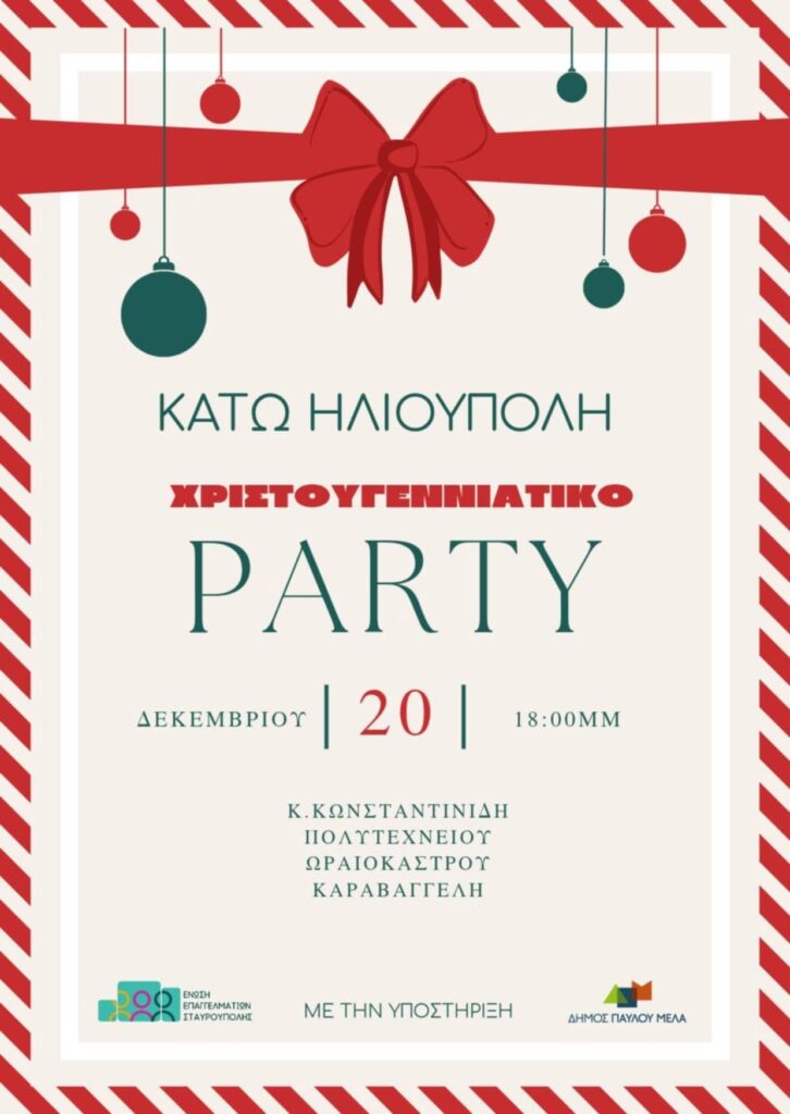 Η Κάτω Ηλιούπολη ετοιμάζεται να φορέσει τα γιορτινά της, καθώς στις 20 Δεκεμβρίου, στις 18:00 το απόγευμα, διοργανώνεται χριστουγεννιάτικο πάρτι σε μία προσπάθεια να τονωθεί η αγορά. Η εκδήλωση θα πραγματοποιηθεί στη συμβολή των οδών Κ. Κωνσταντινίδη, Πολυτεχνείου, Ωραιοκάστρου και Καραβαγγέλη, προσφέροντας μια ζεστή χριστουγεννιάτικη ατμόσφαιρα για κατοίκους και επισκέπτες. Τη διοργάνωση στηρίζει η Ένωση Επαγγελματιών Σταυρούπολης, καθώς και ο Δήμος Παύλου Μελά.