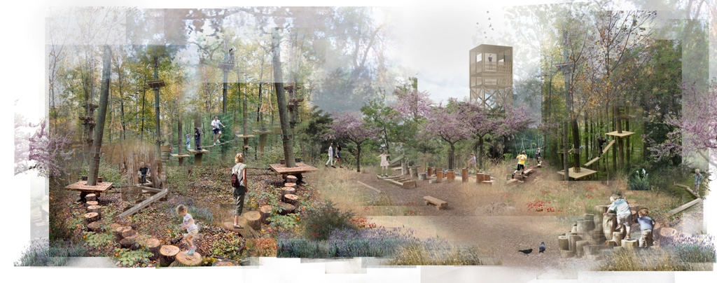 ΑΠΟΣΠΑΣΜΑ από τα σχόλια της επιτροπής: Παρατηρείται ένας εξαιρετικός σχεδιασμός, ο οποίος εκμεταλλεύεται το φυσικό ανάγλυφο και γενικότερα το φυσικό τοπίο, εντάσσοντας την “Περιπέτεια” σε όλη τη διαθέσιμη έκταση. Διαμορφώνονται διαφορετικά σημεία διάδρασης και παιχνιδιού που στόχο έχουν τη βιωματική εμπειρία μέσα στο υφιστάμενο περιβάλλον. Ενδιαφέρον παρουσιάζει και η συμπερίληψη της ένταξης του περιβάλλοντος χώρου γύρω από τα κτίρια στη λογική της περιπέτειας, όπου προβλέπονται διαδραστικά παιχνίδια. Η κορύφωση του σχεδιασμού βρίσκεται στο υδάτινο στοιχείο με ανακυκλούμενο νερό, το οποίο δημιουργεί διαφορετικές ποιότητες και εναρμονίζεται με το ανάγλυφο συνομιλώντας μαζί του. Πολύ ενδιαφέρον παρουσιάζουν και οι κατασκευές από φυσικά υλικά, κορμούς και ξύλα στο ανατολικό τμήμα, καθώς και ο πύργος παρατήρησης. Όλα τα στοιχεία εξυπηρετούν την έννοια της περιπέτειας, καθώς προσφέρουν ευελιξία και δίνουν τη δυνατότητα στον χρήστη να φανταστεί και να ζήσει την περιπέτεια όπως ο ίδιος την αντιλαμβάνεται.