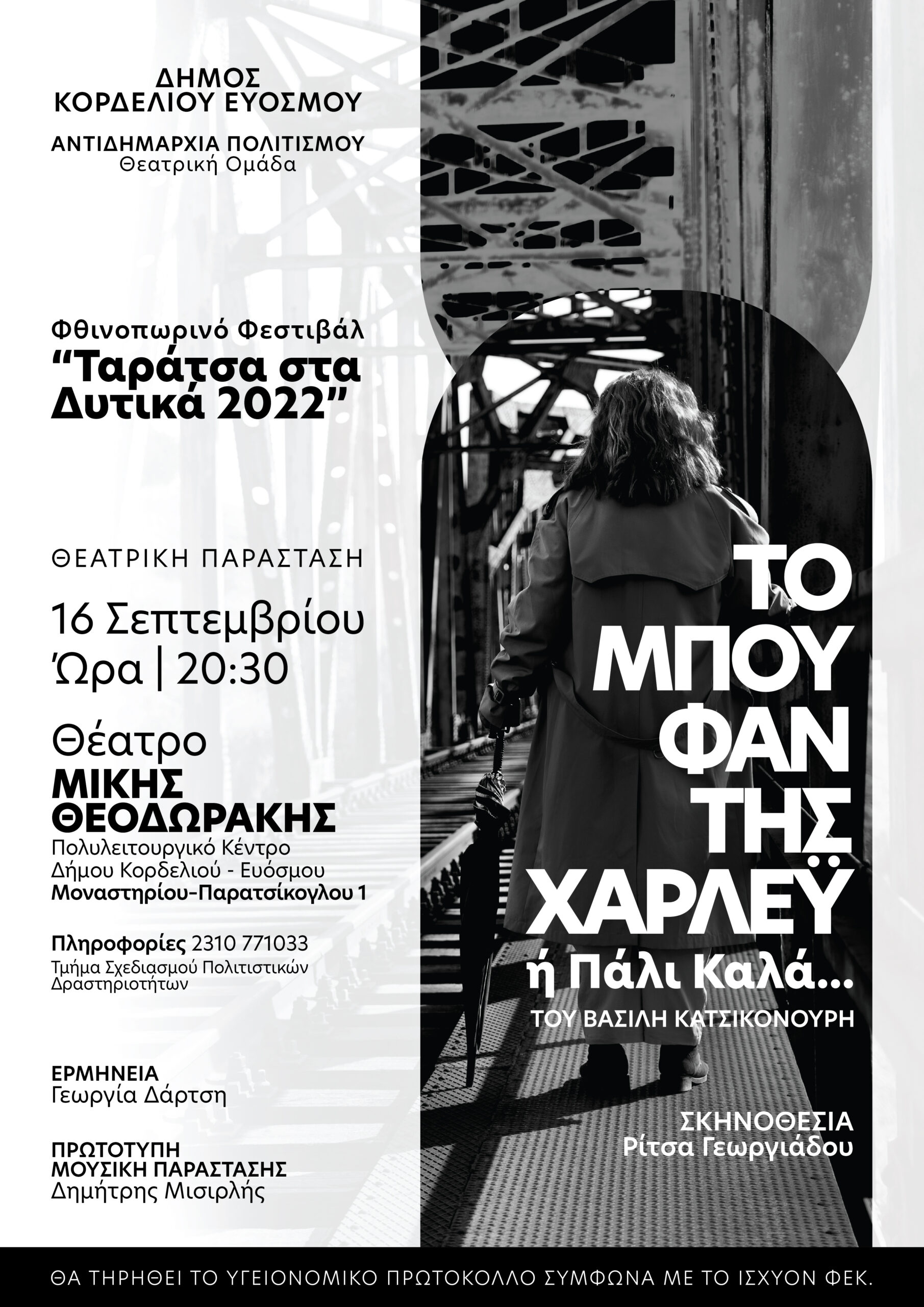 Με την παράσταση της Θεατρικής Ομάδας του Δήμου Κορδελιού Ευόσμου “Το Μπουφάν της Χάρλεϊ ή Πάλι καλά” του Βασίλη Κατσικονούρη, σε σκηνοθεσία Ρίτσας Γεωργιάδου ανοίγει την Παρασκευή 16 Σεπτεμβρίου στις 20.30μμ η αυλαία του 2ου Φεστιβάλ “Ταράτσα στα Δυτικά”.