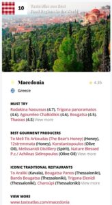 Μάλιστα, το Taste Atlas καλεί τους επισκέπτες του που θα βρεθούν στη Μακεδονία να μην ξεχάσουν να δοκιμάσουν ροδάκινα Νάουσας, τρίγωνα Πανοράματος, αγουρέλαιο Χαλκιδικής και μπουγάτσα Θεσσαλονίκης.
