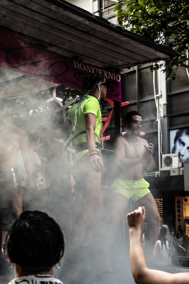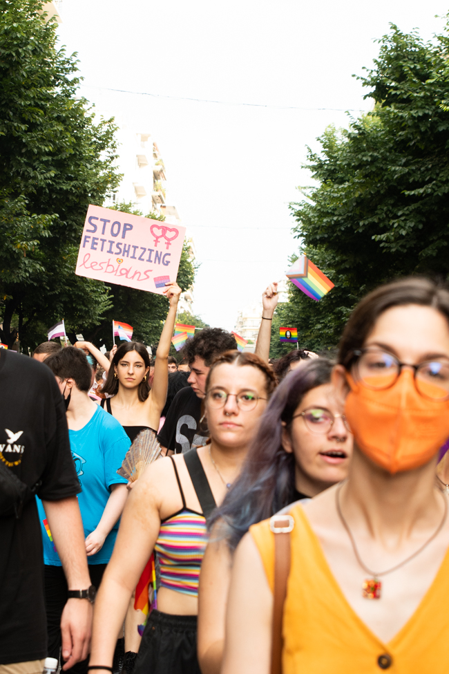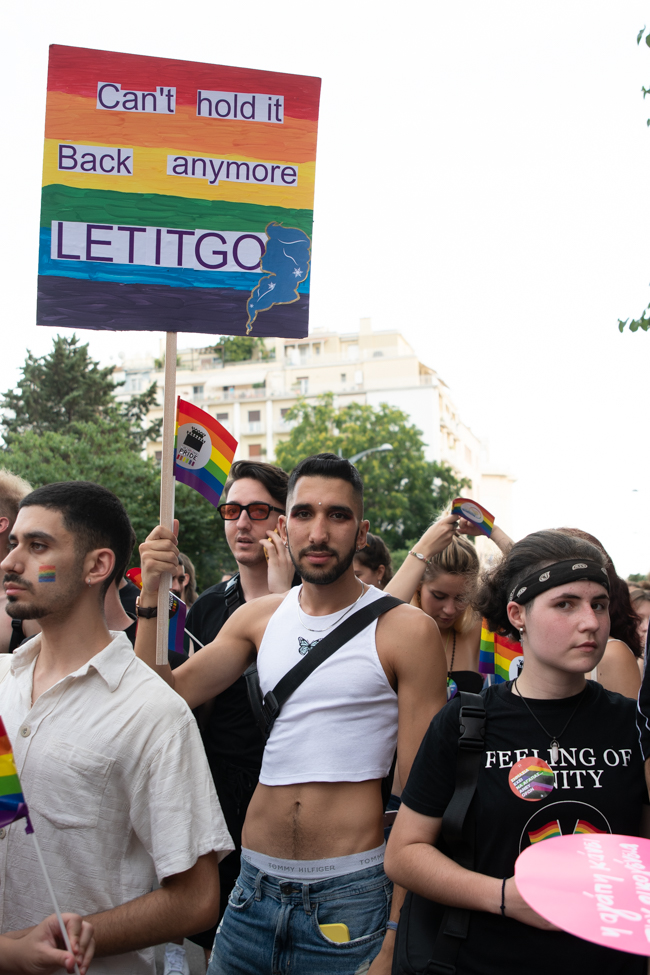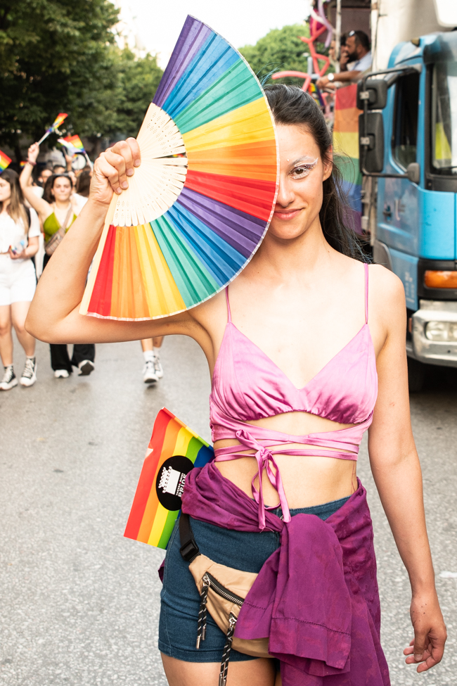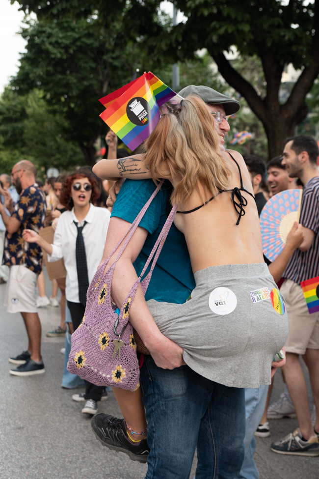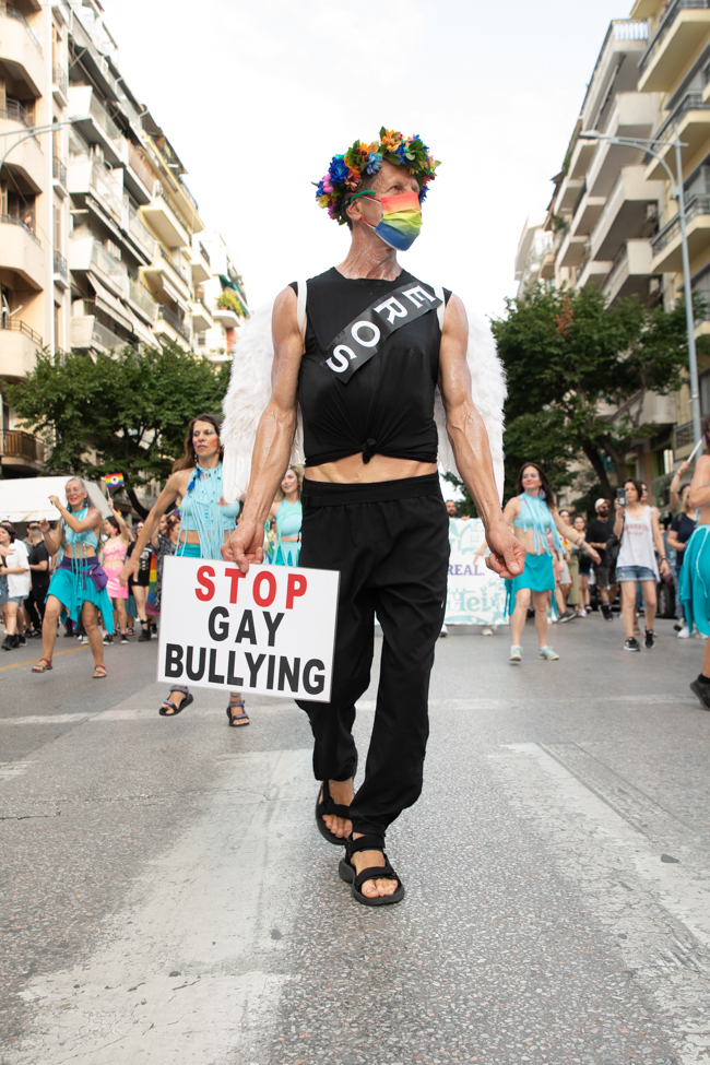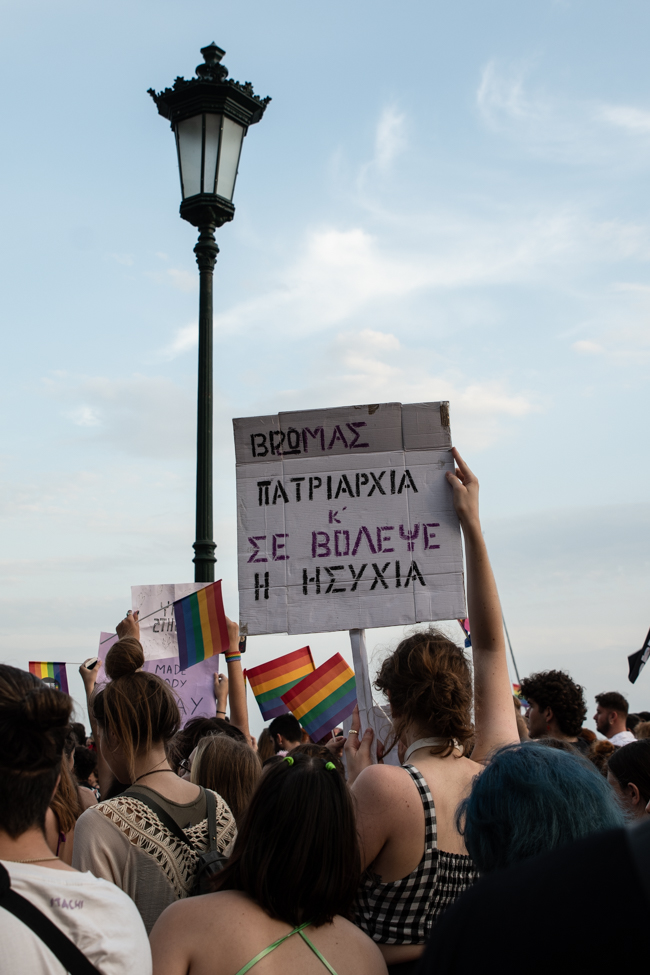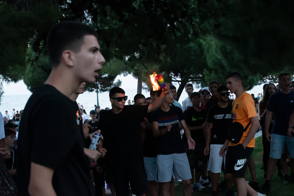 Μα είδα και το φίδι, ήταν εκεί όπως πάντα στημένο ύπουλα στη σκιά του. Το μίσος και η μισανθρωπιά, ο δολοφονικός φόβος ενάντια σε κάθε τι διαφορετικό. Μια μεγάλη παρέα μικρών παιδιών στην κατάληξη της παρέλασης στον Λευκό Πύργο προκαλούσαν κι έβριζαν χυδαία. Έκαψαν κι έφτυσαν τη σημαία του Pride κάνοντας χειρονομίες φωνάζοντας και προκαλώντας τους «πούστηδες» όπως έλεγαν. Ένα μικρό πιτσιρίκι όρμηξε σε μένα επειδή είχα τη φωτογραφική μηχανή και ένα άλλο μου έπιασε το χέρι φωνάζοντας πως παρανομώ – εγώ! επειδή φωτογράφισα τη φωτιά στη σημαία, αναποτελεσματικά και οι δύο.