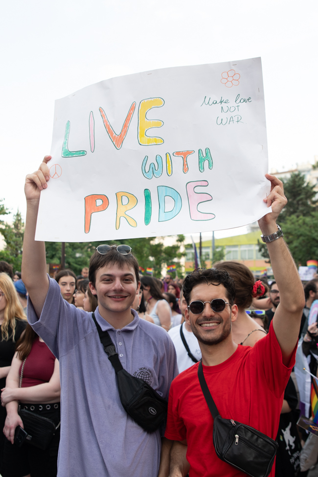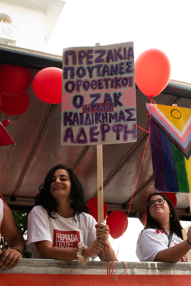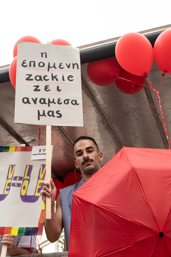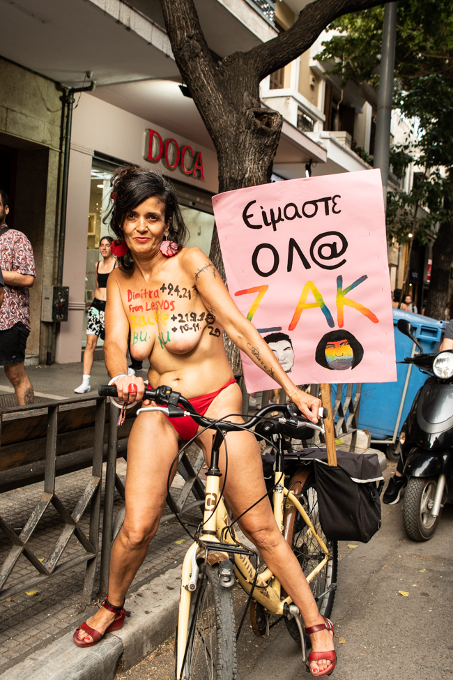 Άκουσα κορίτσι που κράταγε πανό να λέει «ωχ η μάνα μου» και γυρνώντας με αγωνία να δω την αντίδραση της μάνας, εντόπισα μέσα στο πλήθος μια αγκαλιά ανοιχτή κι ένα διάπλατο χαμόγελο. Φωτογράφισα απόκοσμα μάτια, μελαγχολικά να κρατούν το όνομα του Ζακ στα χέρια και να είναι μελαγχολικά απόμακρα απ΄ το πανηγύρι καθώς το σύνθημα έγραφε « Η επόμενη Zackie ζει ανάμεσά μας». Είδα και όλοι είδαμε και πολλοί βουρκώσαμε με μια γιαγιά πανέμορφη με κρυστάλλινα μάτια να αγκαλιάζει, να στέλνει φιλιά και να χορεύει με τους άγνωστους νέους δίπλα της. Ένας νέος άνδρας βούτηξε στην αγκαλιά της γιατί είχε ανάγκη από αγάπη όπως όλοι μας. Είδα τους κωφούς φίλους μου να στέκονται δίπλα στα κρουστά για να νιώθουν τον παλμό στο στήθος τους, να διεκδικούν κι εκείνοι μια κοινωνία ισότητας και αποδοχής.