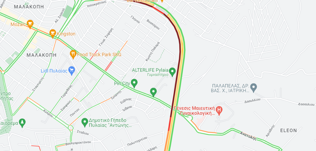 Οι ταχύτητες με τις οποίες κινούνται τα αυτοκίνητα είναι αρκετά χαμηλές, ενώ το μποτιλιάρισμα φαίνεται να φτάνει μέχρι το ύψος της Πυλαίας.
