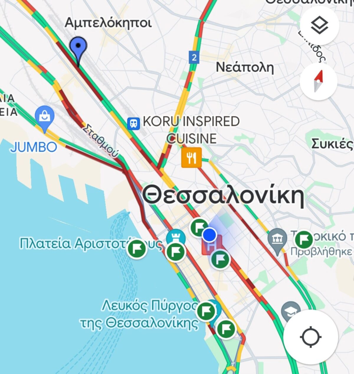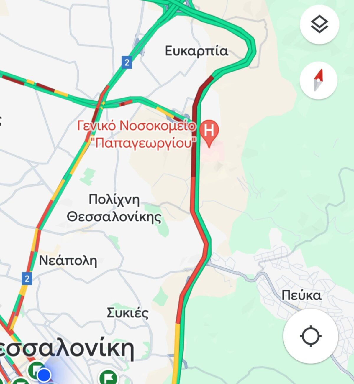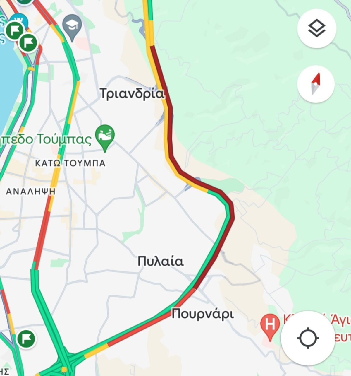 Στο «κόκκινο» βρίσκεται και η Μοναστηρίου, στο ρεύμα προς ανατολικά, από το ύψος του One Salonica έως και το ύψος του ΑΧΕΠΑ, ενώ πρόβλημα εντοπίζεται και στο ρεύμα προς δυτικά από το ύψος της Καμάρας έως και τη Βενιζέλου.